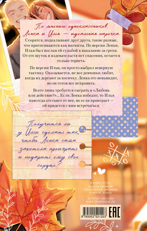 Серия: #trendbooks Книга «Любовь или действие?» Рины Ушаковой — легкая молодежная история о первой любви и школьной жизни. Издание с цветными форзацами и нахзацами и 4 яркими иллюстрациями от Miorin. Одноклассники считают, что Лена и Илья — идеальная пара. Такие разные, что притягиваются, как магниты. Лена считает, что Илья послан ей судьбой в наказание за грехи и ей остается только терпеть его шутки и издевательства. |