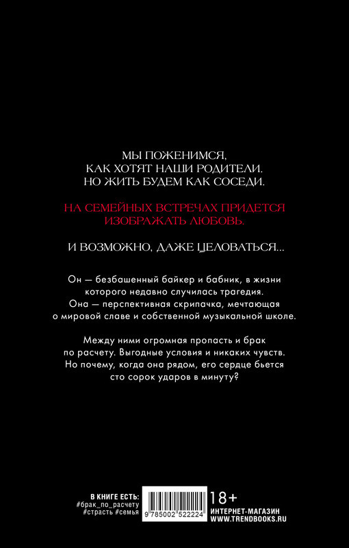 Обжигающая страсть, брак по расчету и столкновение противоположностей. Он — безбашенный байкер и бабник, недавно переживший трагедию. Она — талантливая скрипачка, мечтающая о мировой славе и собственной музыкальной школе. Между ними огромная пропасть и брак по расчету. Им приходится играть в любовь, изображая мужа и жену. Но играют ли они? Почему, когда она рядом, его сердце бьется сто сорок ударов в минуту?