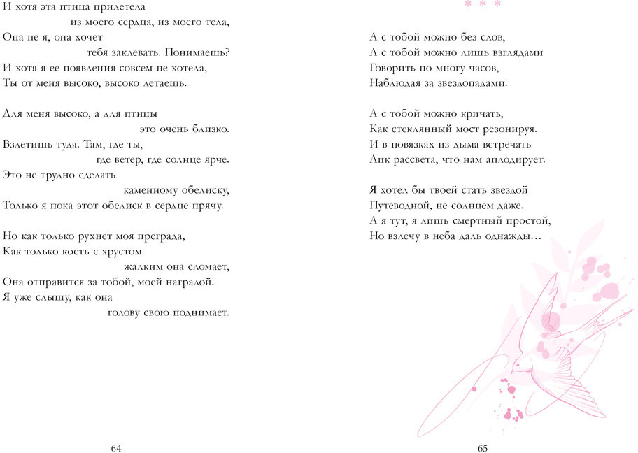 Первая часть сборника — «Лирика», пронзительные стихи о любви, повседневных чудесах и тихих откровениях. Вторая — поэтическое отражение миров ее героев: от мятежной Тани Ведьминой до персонажей дилогии «Притворись моей парой», от нежной колыбельной «Нежеланной невесты» до резких слов «Поклонника» и даже строк по мотивам неоконченной книги «На подмостках волшебства». Это возможность взглянуть на любимые интересные книги в новом, лирическом измерении, заново перечитать знакомый роман, но уже с точки зрения его персонажей.