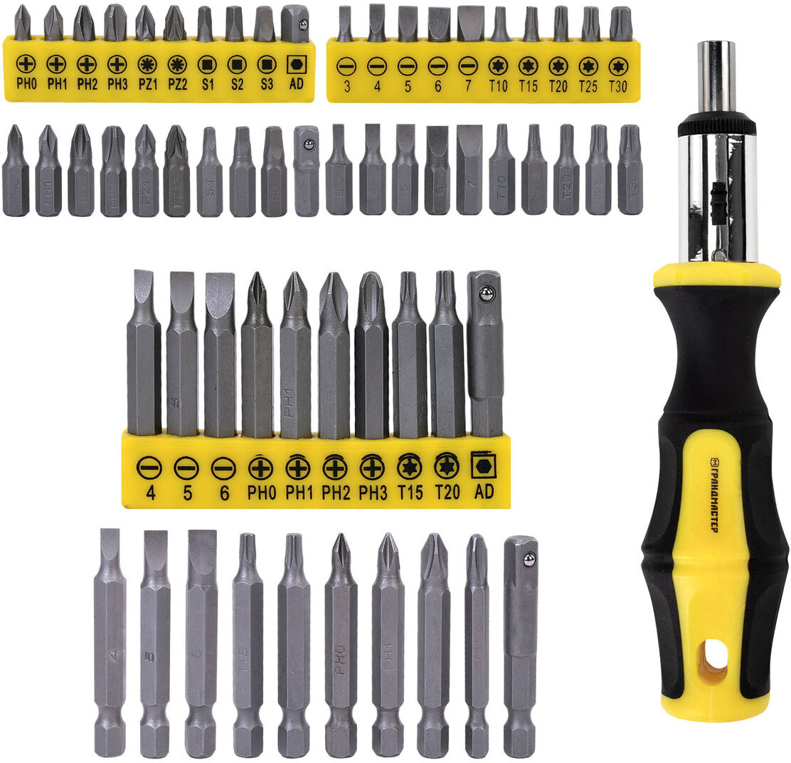 • биты 50 мм (SL: 4, 5, 6; PH: 0, 1, 2, 3; T: 15, 20; AD) — 10 шт.;