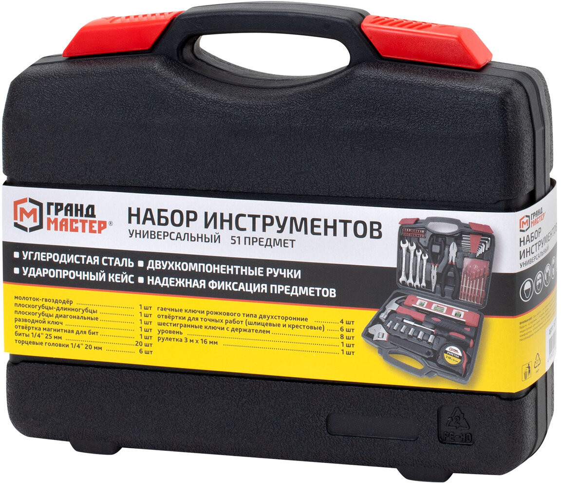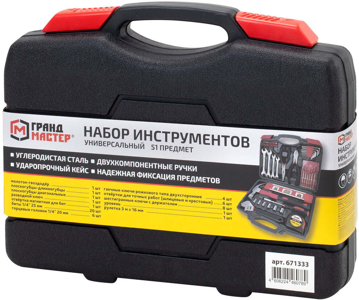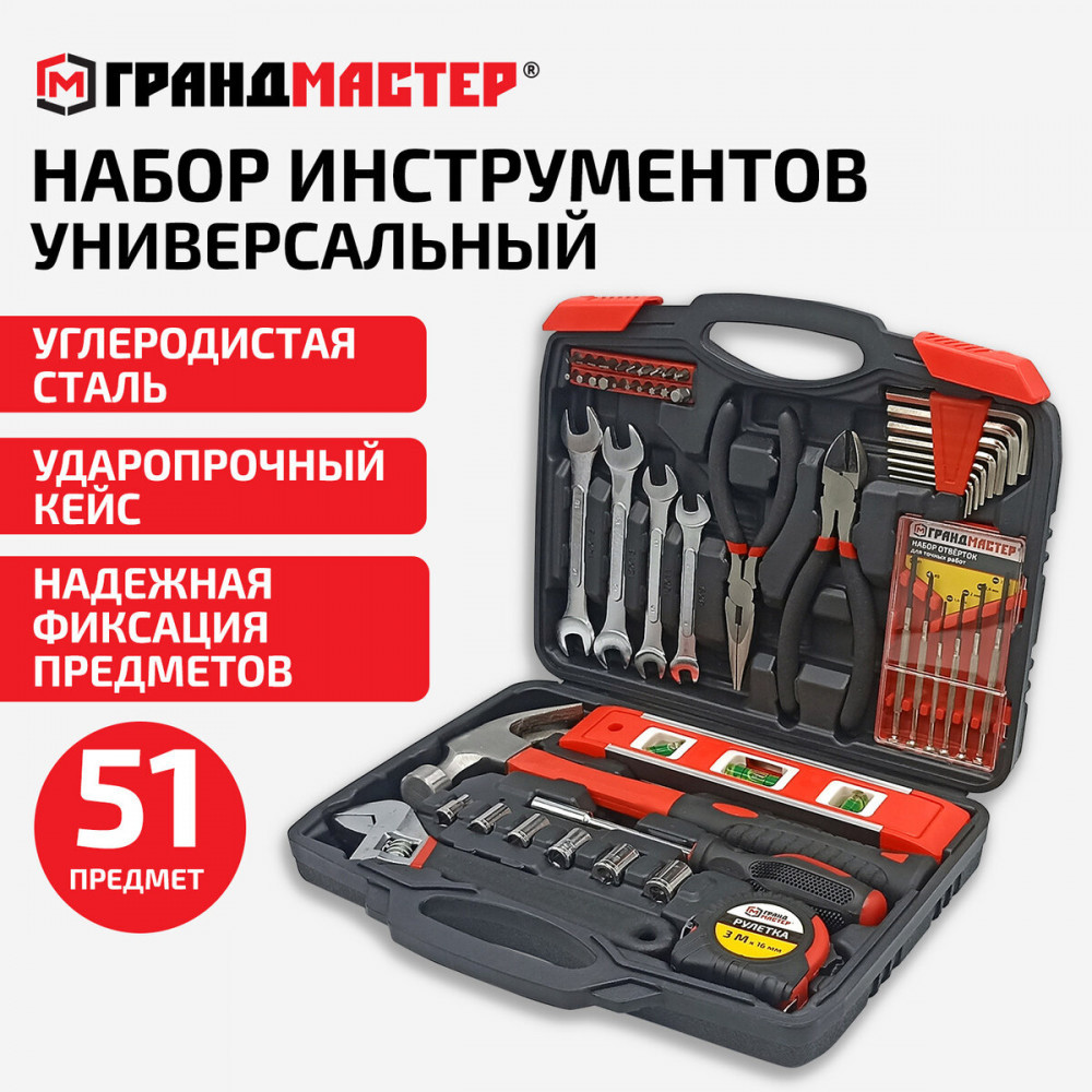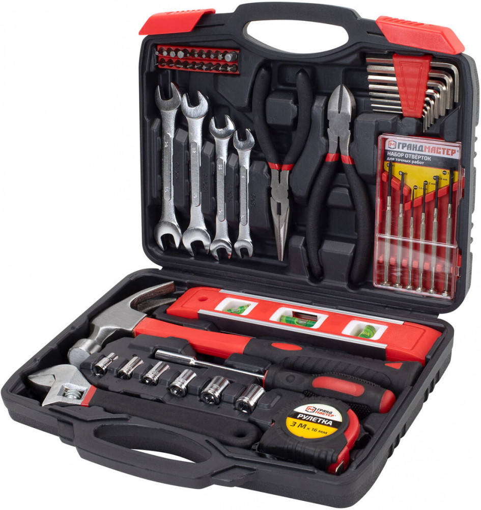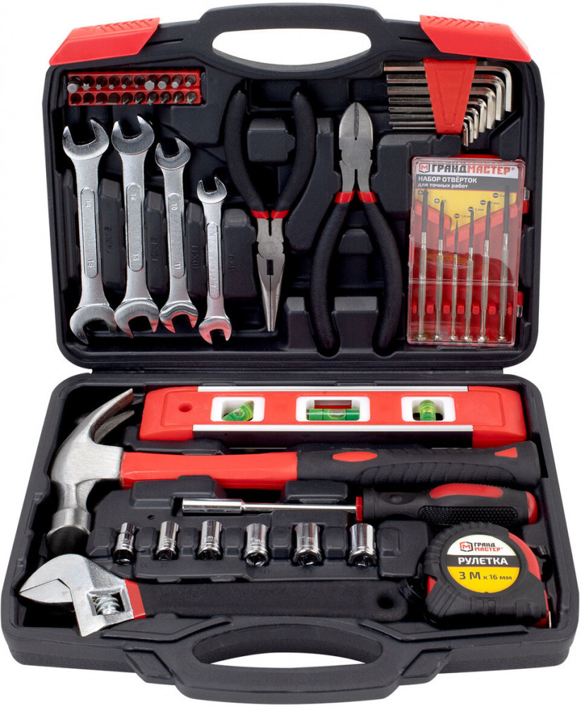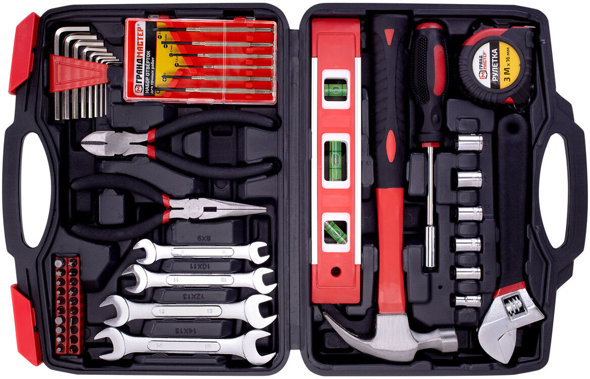 Универсальный набор Грандмастер включает в себя необходимые инструменты для использования в быту. Состав набора позволит выполнить мелкий ремонт дома и на даче, а также пригодится для ремонта колесной и бытовой техники.