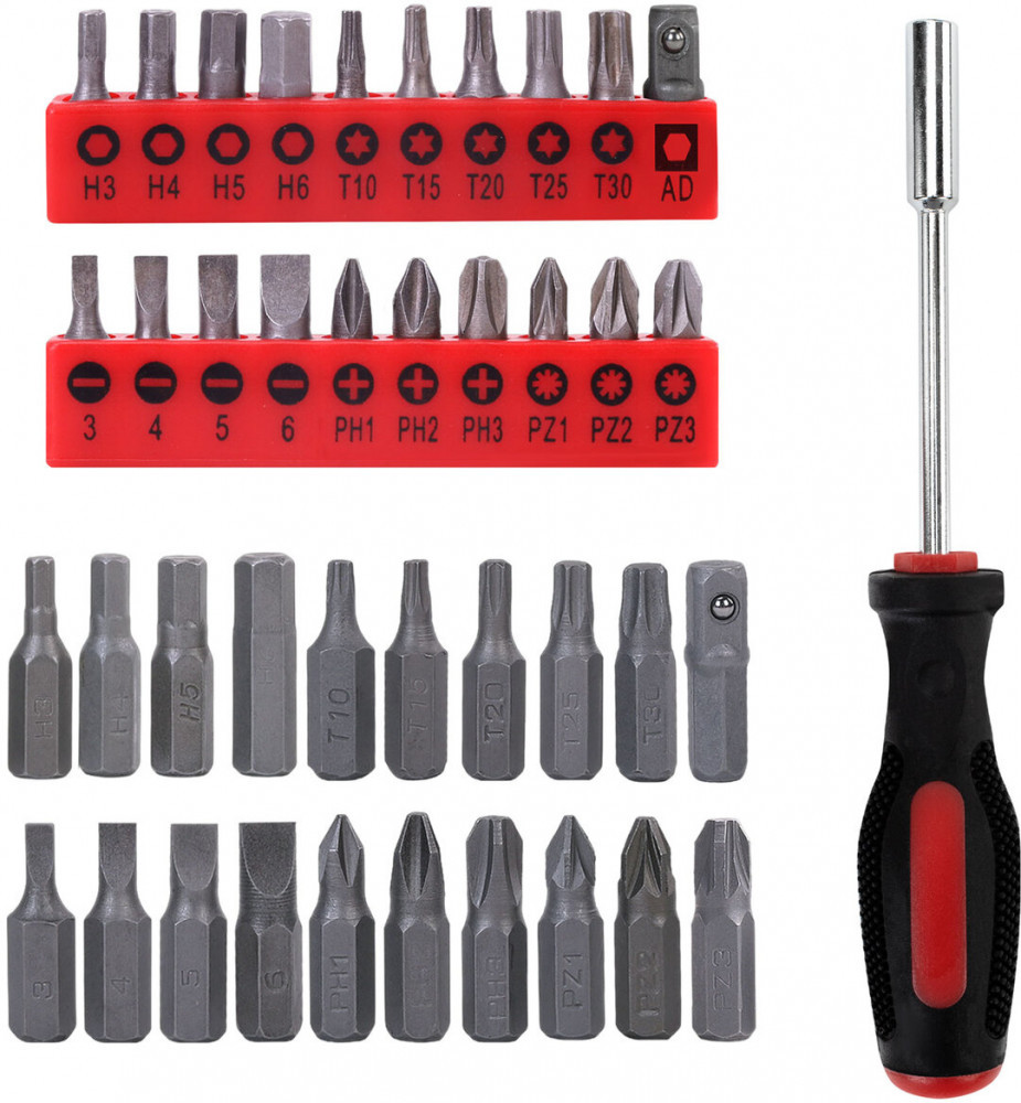 • биты 1/4" 25 мм (SL: 3, 4, 5, 6; PH: 1, 2, 3; PZ: 1, 2, 3; H: 3, 4, 5, 6; T: 10, 15, 20, 25, 30, AD) — 20 шт.;