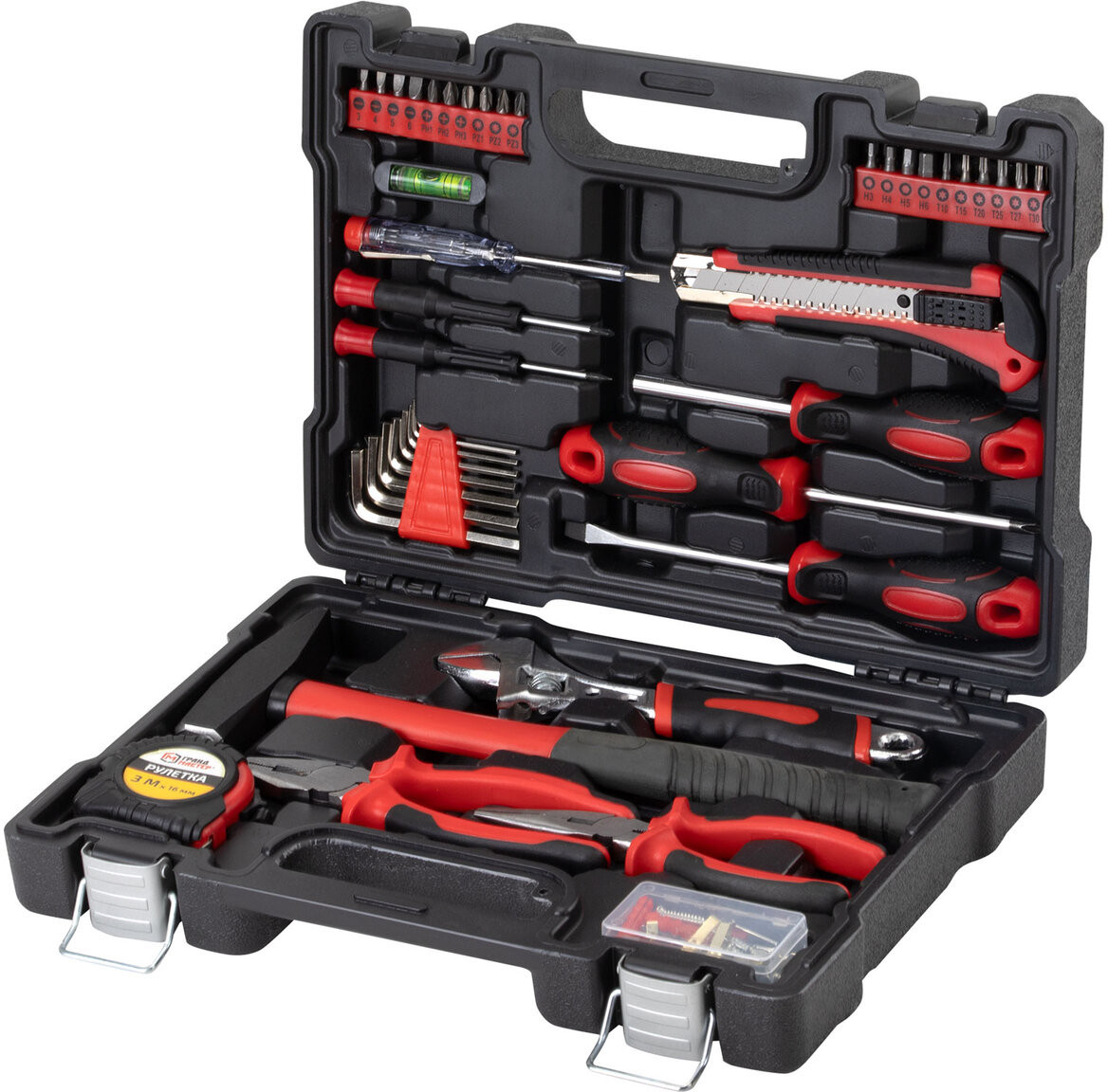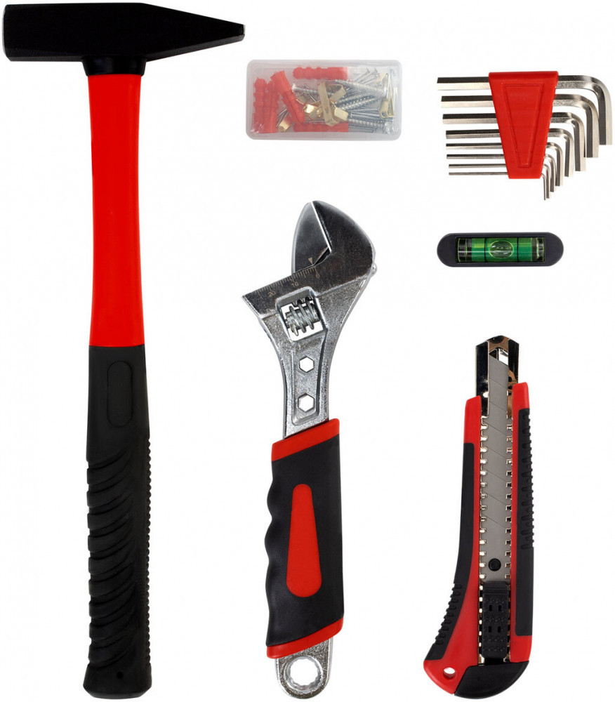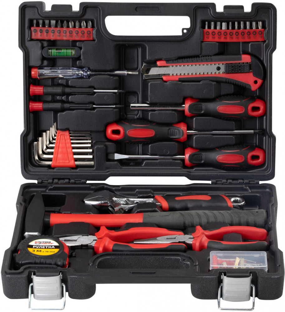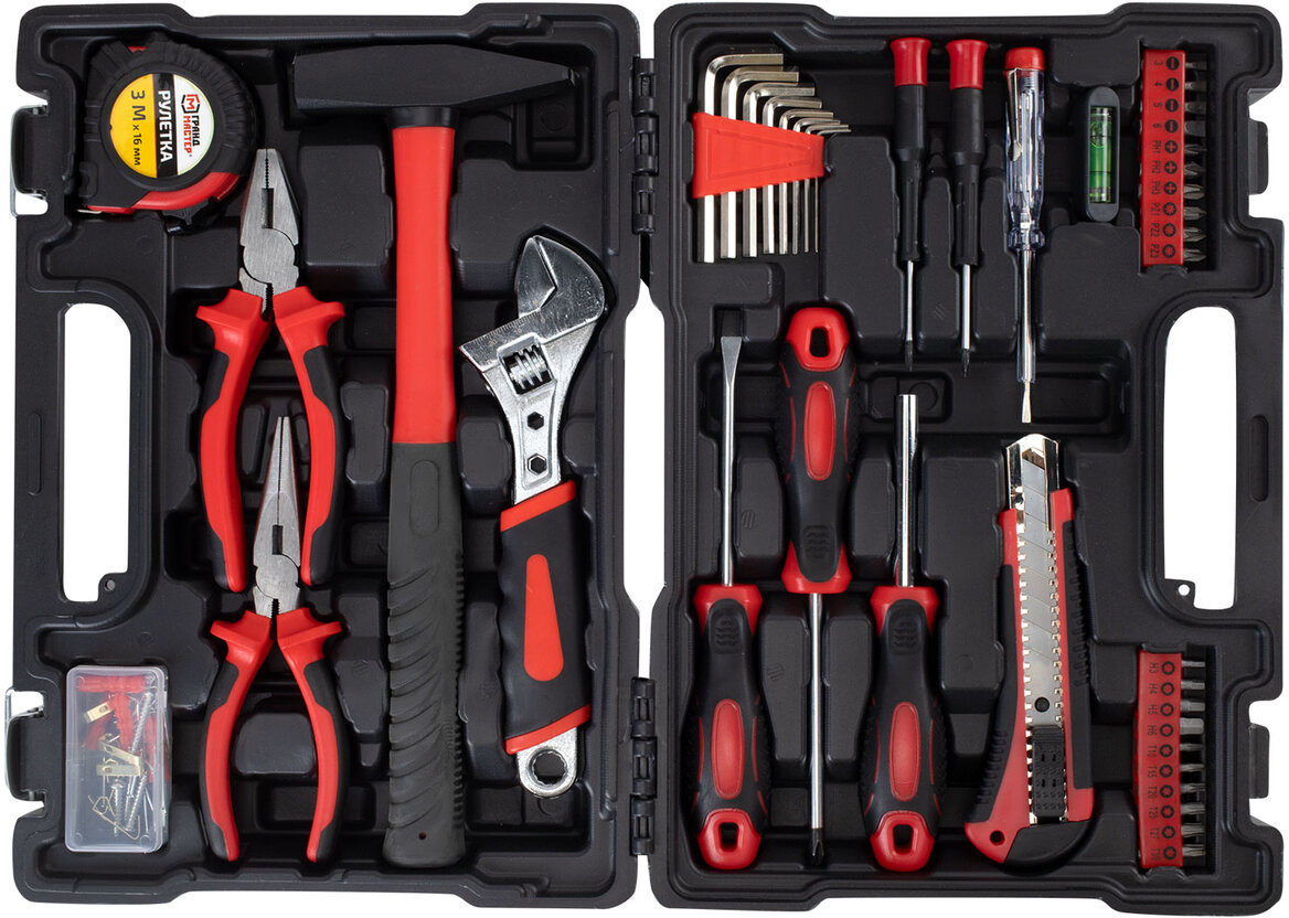 Инструменты изготовлены из закалённой углеродистой стали. Рукоятки выполнены из нескользящего ПВХ для максимального комфорта и безопасности во время использования. В состав набора входят инструменты, необходимые в столярно-слесарном деле, для ремонта автомобиля и любой колесной техники, бытовой техники, а также мебели.