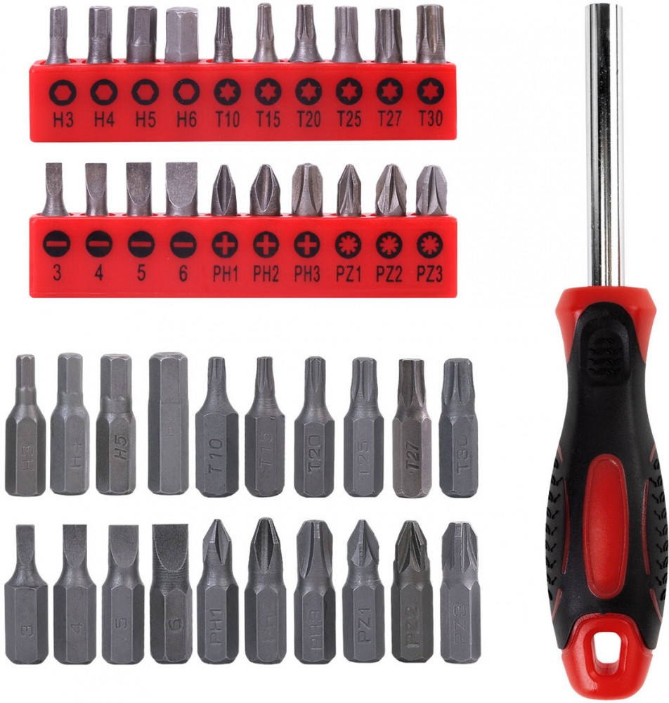 • биты 1/4" 25 мм (SL: 3, 4, 5, 6; PH: 1, 2, 3; PZ: 1, 2, 3; H: 3, 4, 5, 6; T: 10, 15, 20, 25, 27, 30) — 20 шт.;