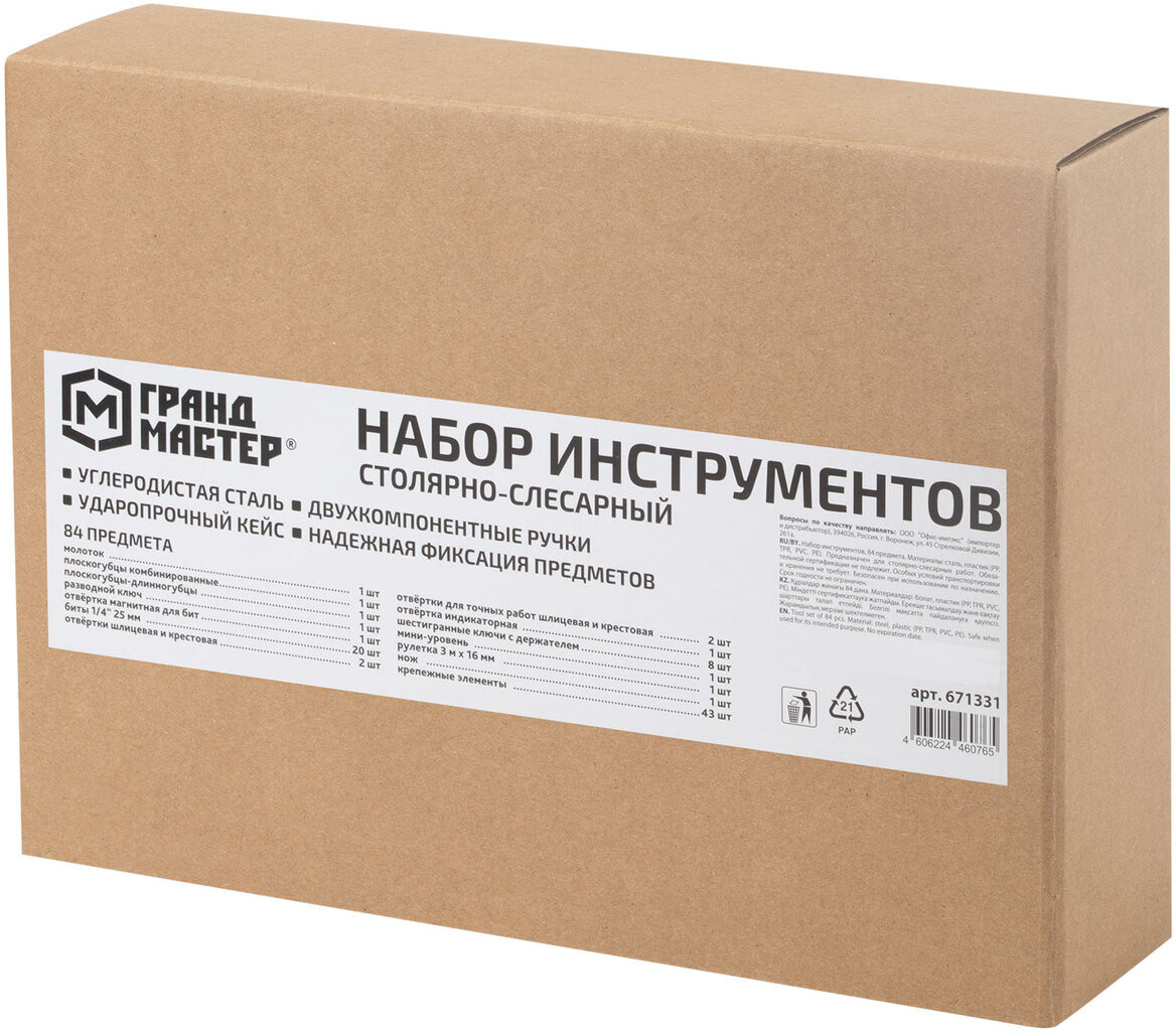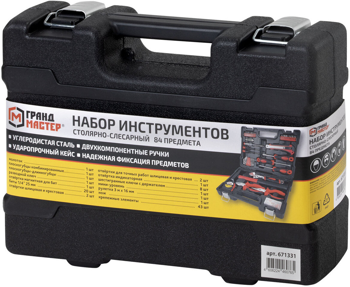 Упакован в цветной рукав, термоусадочную пленку и коричневый гофрокартон. Столярно-слесарный набор инструментов пригодится в любой бытовой ситуации дома, в гараже, на даче, в путешествии. Закажите сейчас и будьте во всеоружии! |