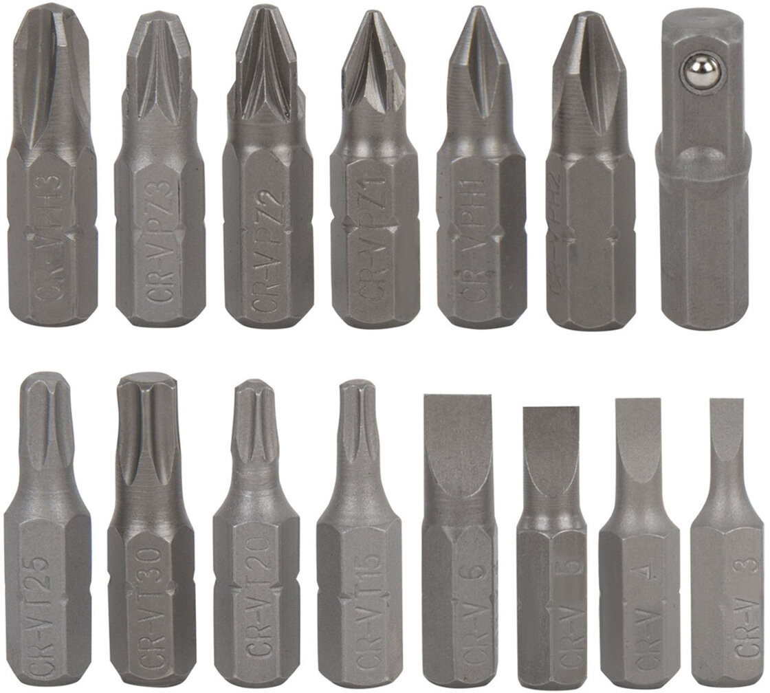 • биты 1/4" 25 мм (SL: 3, 4, 5, 6; PH: 1, 2, 3; PZ: 1, 2, 3; T: 15, 20, 25, 30) — 14 шт.;