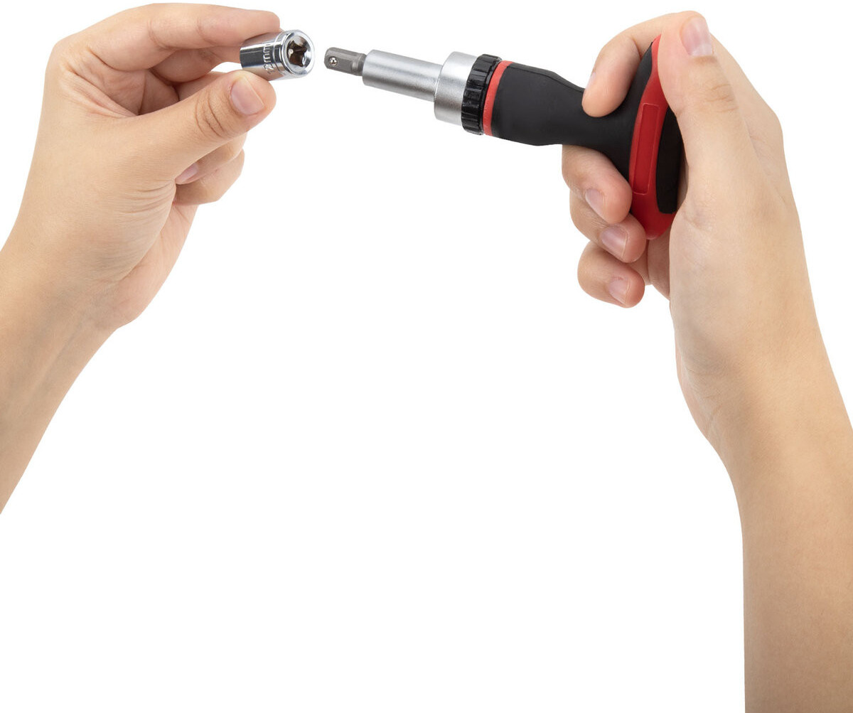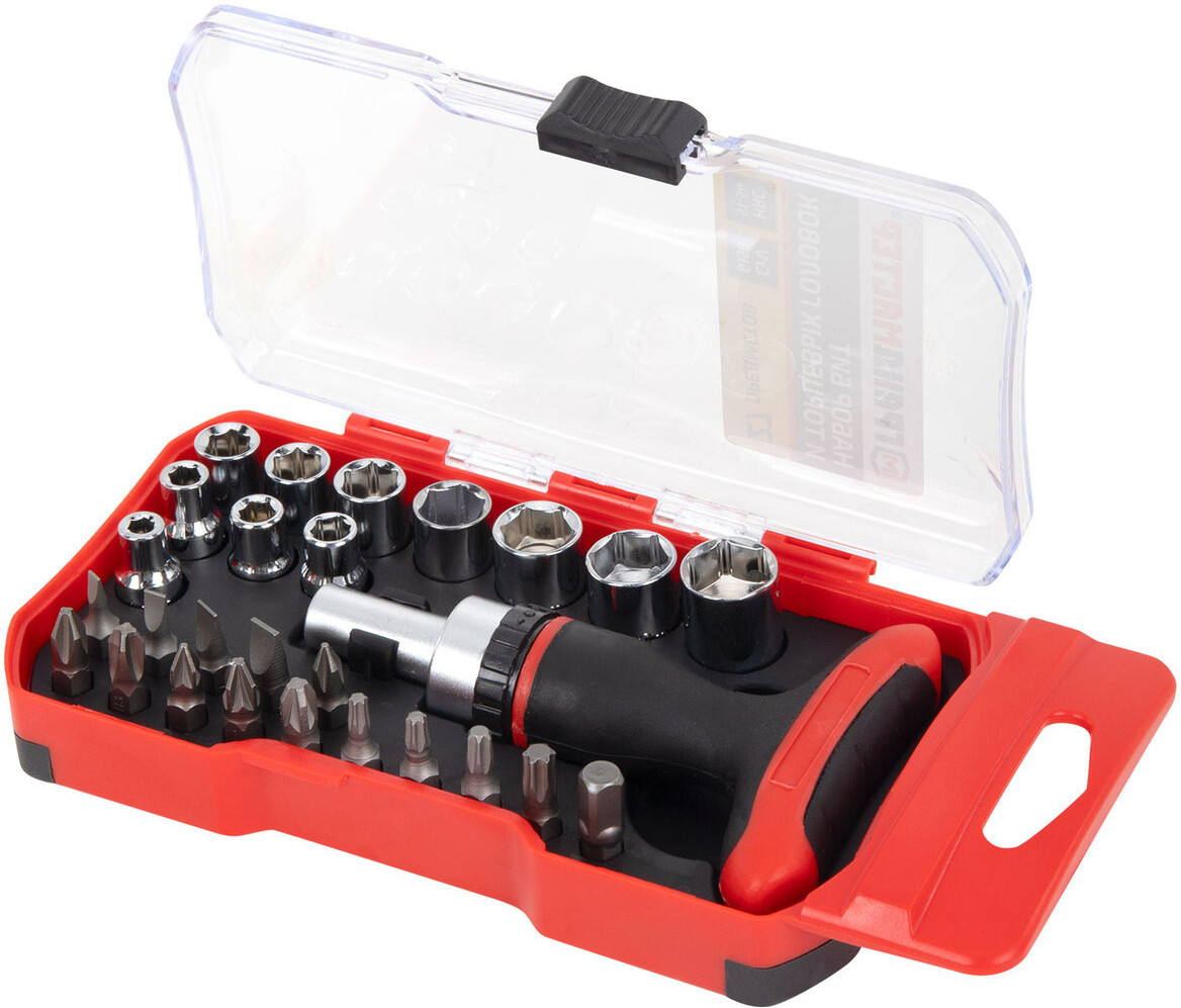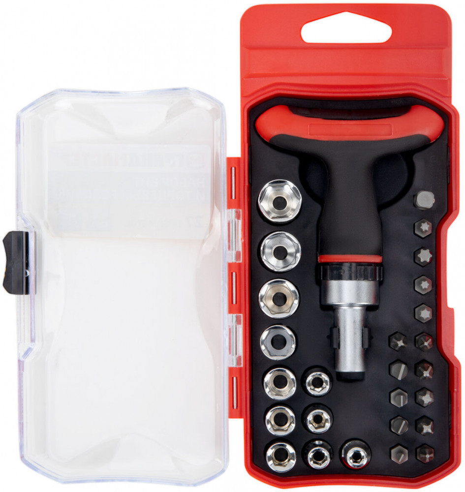 Рукоятка Т-образной отвёртки для бит с храповым механизмом выполнена из нескользящего пластика с резиновыми вставками для максимального удобства и безопасности во время работы. Инструмент располагается в компактном боксе с прозрачной крышкой и надёжной застежкой для удобства хранения. Каждый предмет в наборе надежно закреплен внутри и не выпадает при переноске.