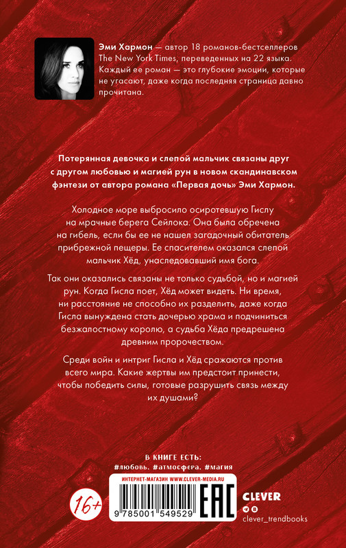Серия: Романы Эми Хармон Захватывающее историческое фэнтези от автора международных бестселлеров Эми Хармон. Вторая часть дилогии. || Потерянная девочка и слепой мальчик связаны друг с другом любовью и магией рун в новом скандинавском фэнтези. Холодное море выбросило осиротевшую Гислу на мрачные берега Сейлока. Она была обречена на гибель, если бы ее не нашел загадочный обитатель прибрежной пещеры. Ее спасителем оказался слепой мальчик Хёд, унаследовавший имя бога. Так они оказались связаны не только судьбой, но и магией рун. Когда Гисла поет, Хёд может видеть. Ни время, ни расстояние не способно их разделить, даже когда Гисла вынуждена стать дочерью храма и подчиниться безжалостному королю, а судьба Хёда предрешена древним пророчеством. Среди войн и интриг Гисла и Хёд сражаются против всего мира. Какие жертвы им предстоит принести, чтобы победить силы, готовые разрушить связь между их душами. |