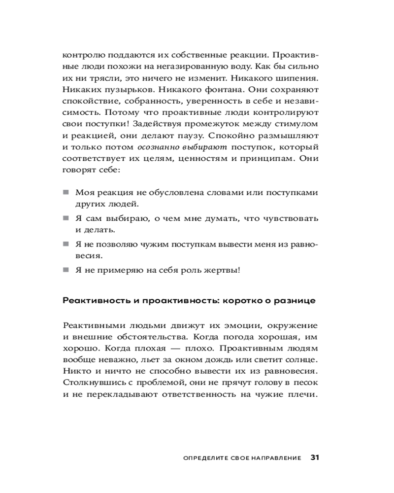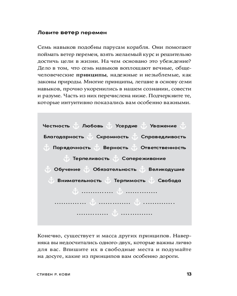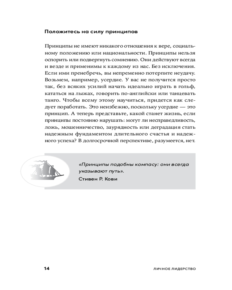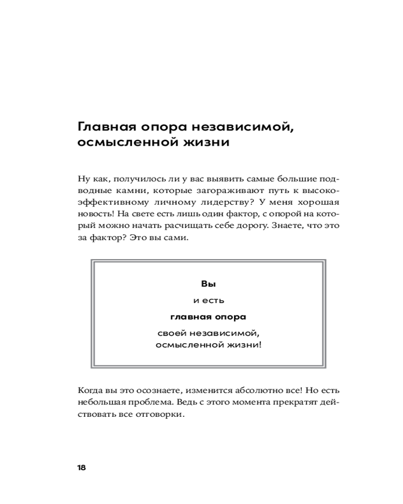 Если вы хотите жить независимой и осмысленной жизнью в мире, полном сложностей, суеты и проблем, вам необходимо научиться личному лидерству: сделать так, чтобы вами управляли не обстоятельства, а ваши собственные решения. Но как этого добиться? Как минимизировать влияние чужих планов, следовать внутреннему голосу и воплощать мечты? Ответы вы найдете в книге Стивена Р. Кови, автора мирового бестселлера «Семь навыков высокоэффективных людей». Сформулированные им принципы помогли миллионам читателей обрести личное счастье и профессиональный успех. Тесты, чек-листы, опросники, упражнения и советы придадут вам смелости проложить свой курс, добиваться целей и жить той жизнью, о которой вы всегда мечтали. |