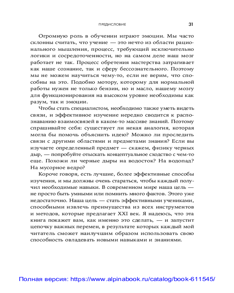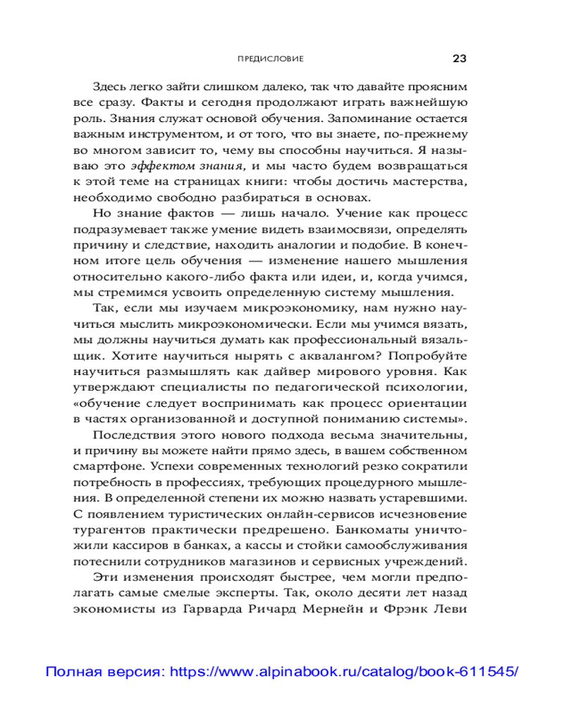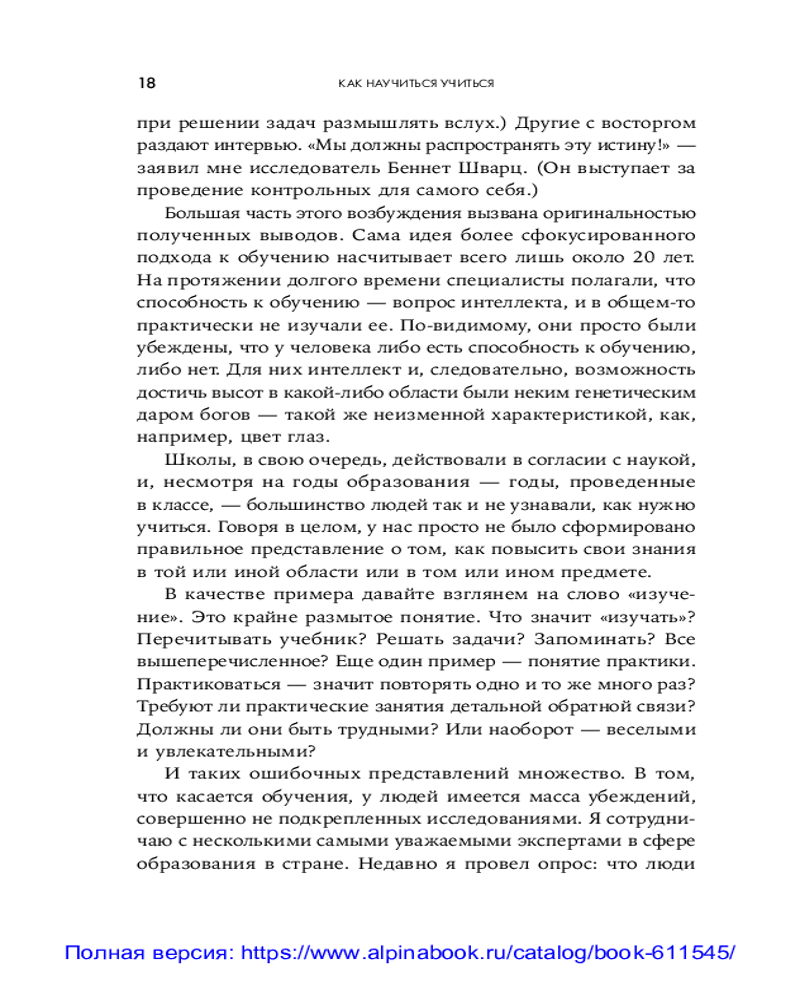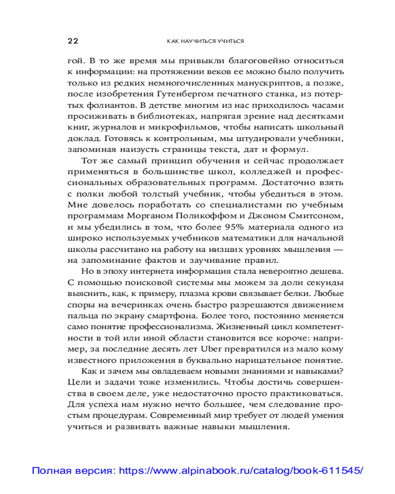 Серия: Альпина. Саморазвитие До недавнего времени процесс обучения сводился главным образом к запоминанию информации: необходимо было зубрить даты, факты, события и в нужный момент применять эти знания. Но в современном мире, где практически любую информацию можно получить за считанные минуты с помощью гаджетов, а искусственный интеллект проникает во все новые сферы жизни, простого запоминания уже недостаточно. |