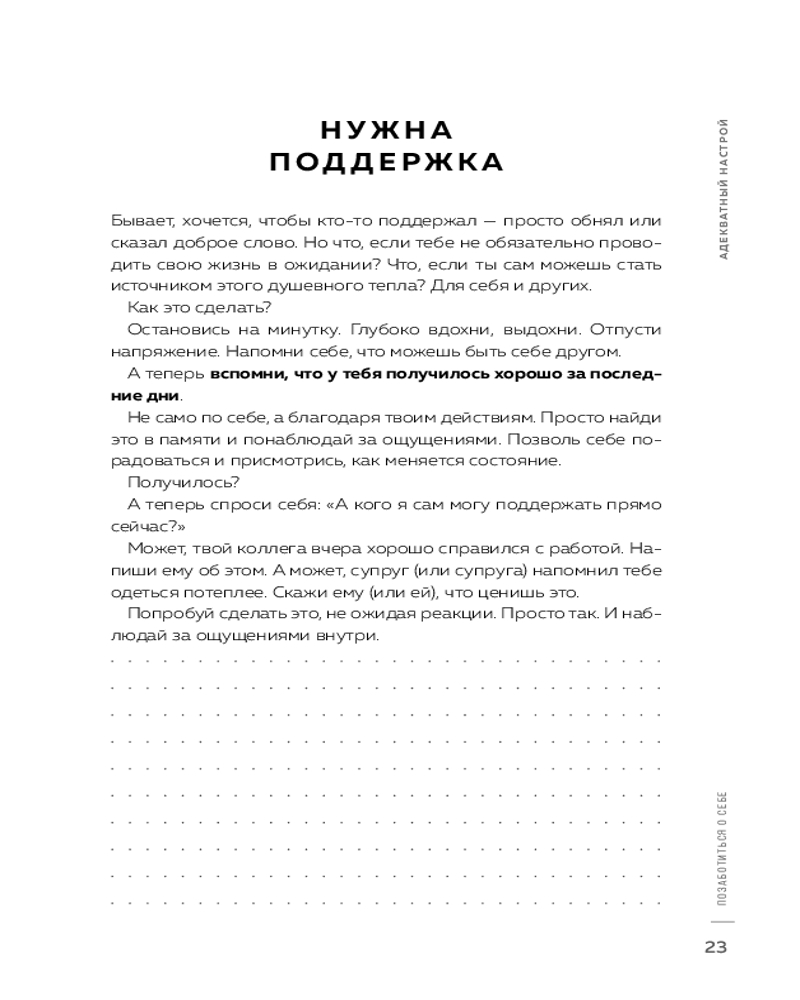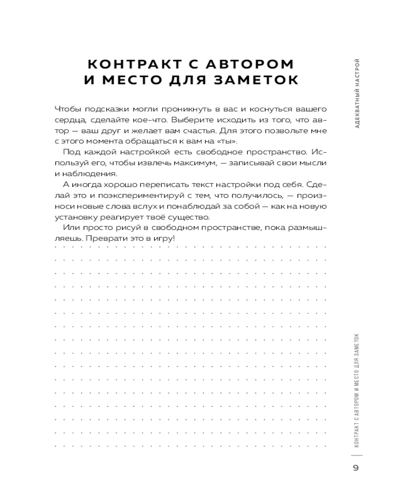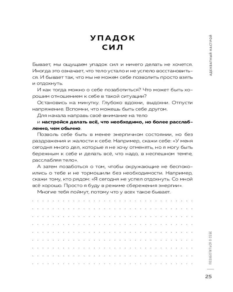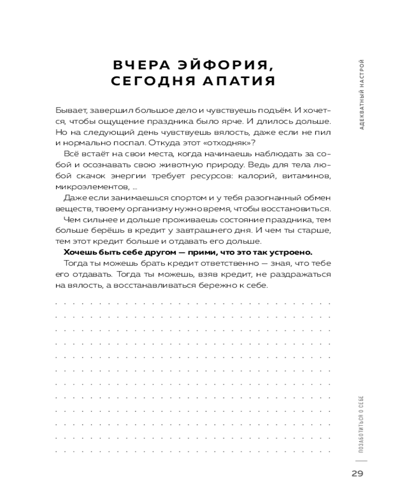 💳 Оплатить за товар можно при получении 🇰🇿 Есть бесплатная доставка по Казахстану от 1 дня 🎁 Копите бонусы с каждой покупки Это практический сборник коротких психологических настроек, которые помогают справляться с эмоциями, понимать себя и осуществлять желаемое. Книга создана как инструмент самопомощи и развития — для тех, кто сталкивается с тревогой, усталостью, виной, сомнениями, апатией, раздражением или чувством вины и хочет научиться быть к бережнее к себе и счастливее. Каждая настройка — это мини-диалог с собой, где автор мягко направляет: что себе сказать, за чем понаблюдать и что заметить. Это не теория и не мотивация, а практика управления собой — ежедневная, тёплая и очень живая. |