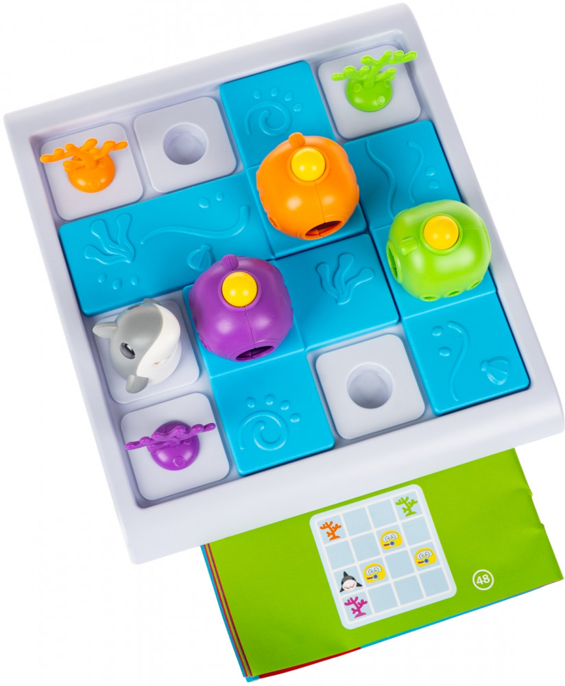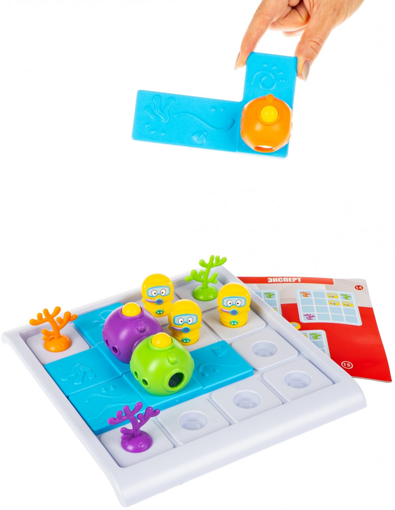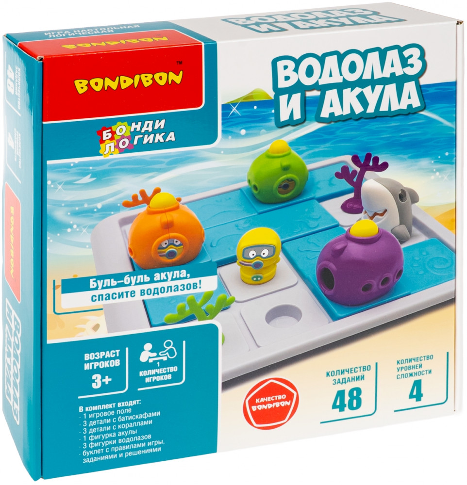 Настольная логическая игра Водолаз и акула серии БондиЛогика от Bondibon превращает подводное приключение в увлекательную головоломку. Яркие фигурки и морской сюжет сразу вовлекают в игру! Разместите детали на игровом поле согласно заданию. Затем расположите три детали-батискафа так, чтобы водолазы могли исследовать океан — снаружи батискафа, если в задании нет акулы, и внутри, если акула находится на игровом поле. У каждого задания есть только одно верное решение! В игре 48 заданий с возрастающим уровнем сложности. Есть задания с акулой и без нее. Головоломка Водолаз и акула развивает пространственное мышление, внимание, логику, моторику, зрительно-моторную координацию и даже эмоциональный интеллект.