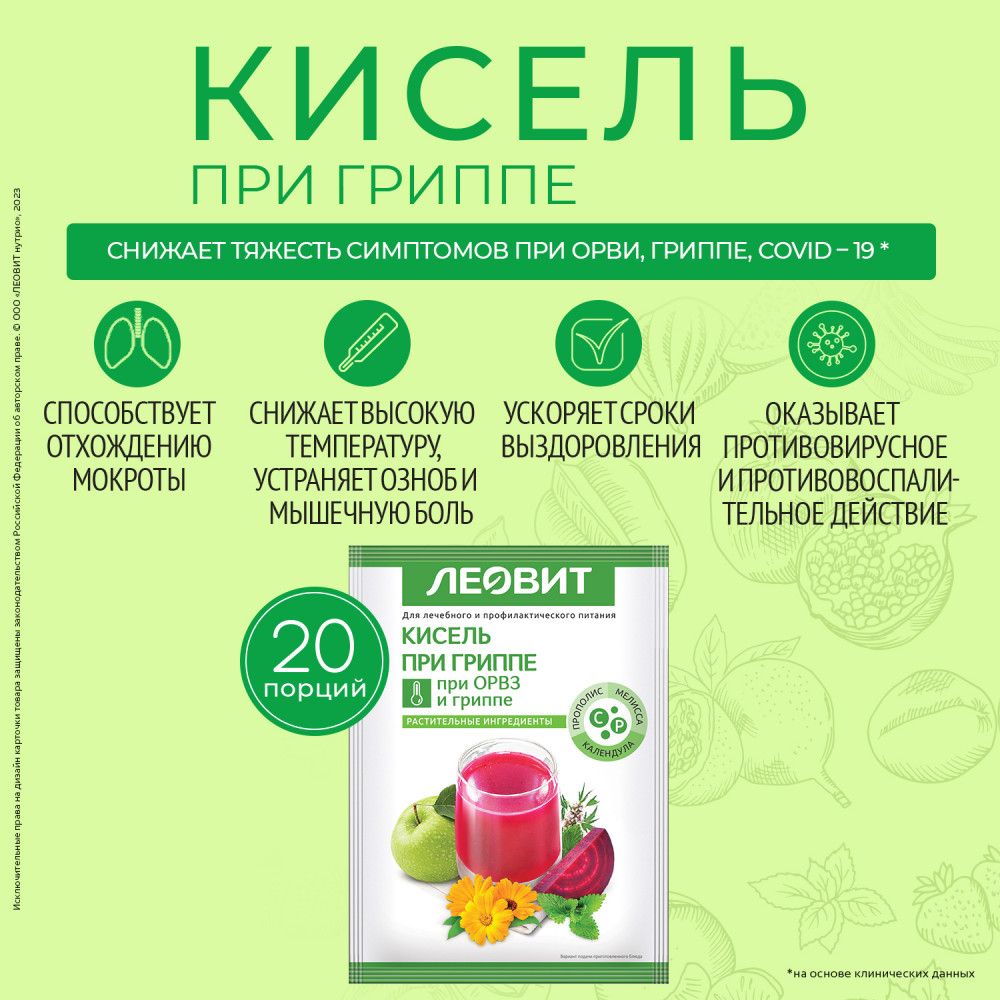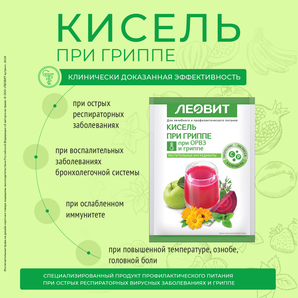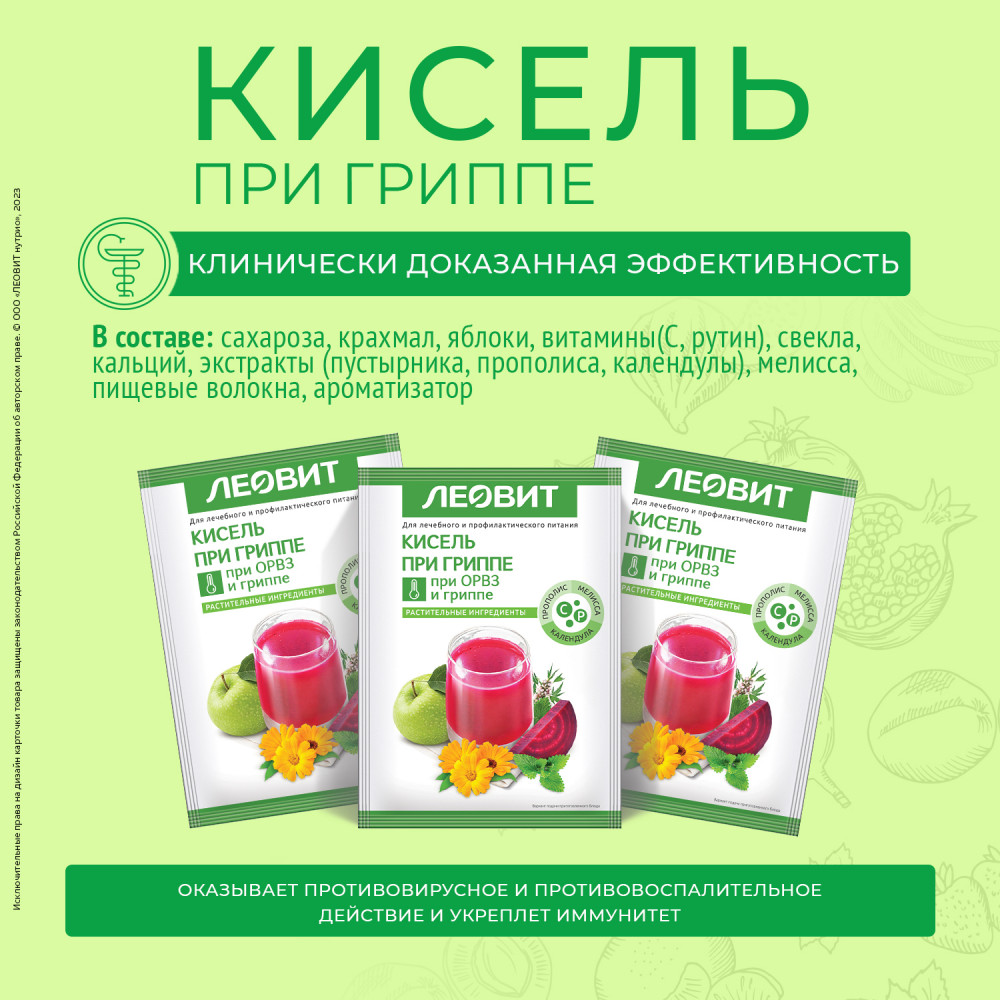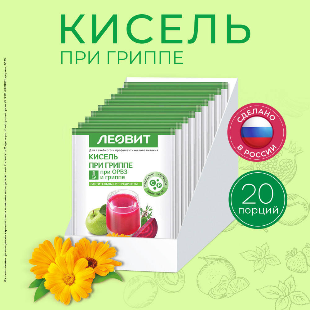 Витаминный кисель При гриппе Леовит относится к диетическому профилактическому питанию при ОРВИ и гриппе. Если пить его во время болезни, витамины и лекарственные травы станут отличным дополнением к основному лечению и ускорят выздоровление.