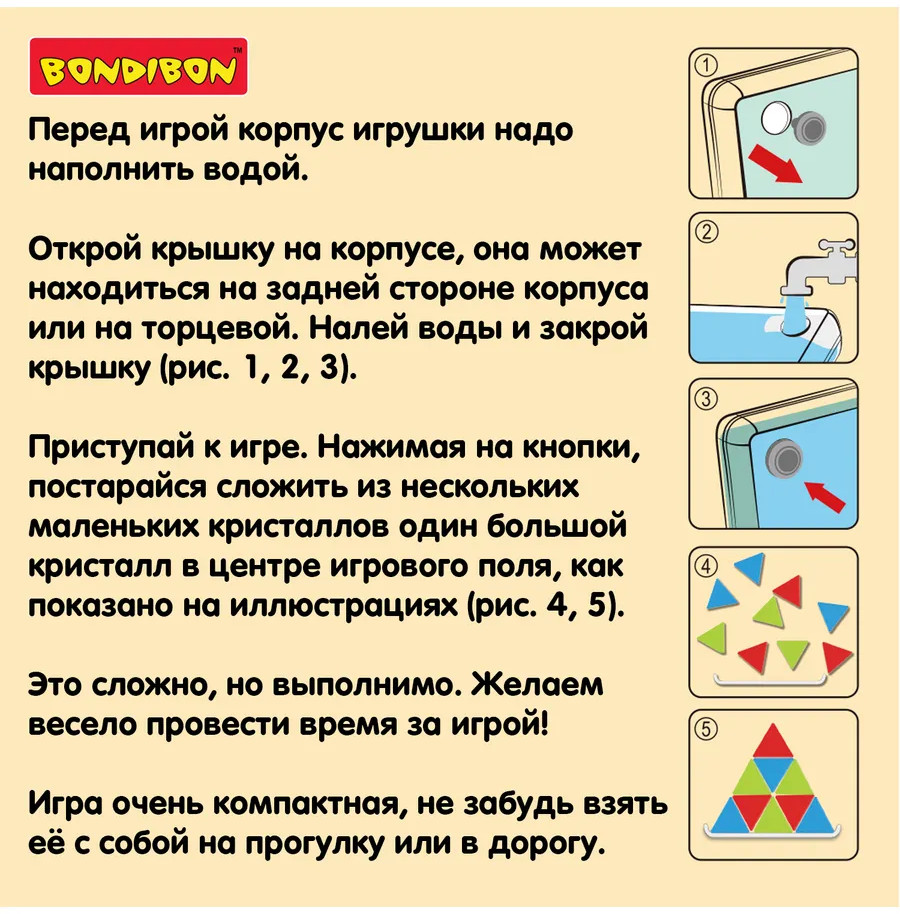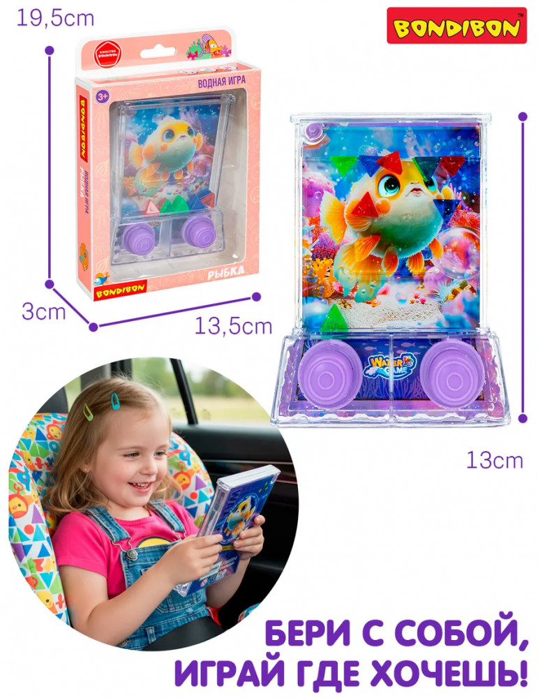 Bondibon Кольцеброс водный с подсветкой «Рыбка»В данный момент этот товар отсутствует в продаже. Возможно, у нас найдется аналогичный или похожий товар здесь. Отправься в захватывающее путешествие вместе с милой рыбкой и попробуй собрать большой кристалл! Компактная водная игра Bondibon не просто развлекает — она развивает ловкость, внимание и моторику. Перед началом игры нужно наполнить корпус игрушки водой, закрыть крышку — и можно начинать! Нажимай на кнопки, чтобы управлять движением разноцветных кристаллов, стараясь собрать из них большой — прямо в центре поля. Такая задача требует концентрации и точности движений, но именно в этом и кроется увлекательность процесса. Игрушка тренирует координацию и терпение. Сенсорное восприятие активизируется за счёт водной среды и тактильных нажатий, а яркий дизайн делает игру привлекательной для малышей. Карманный формат игрушки позволяет брать ее с собой на прогулку, в дорогу или на отдых. . Игра не требует батареек и готова к использованию в любое время. |