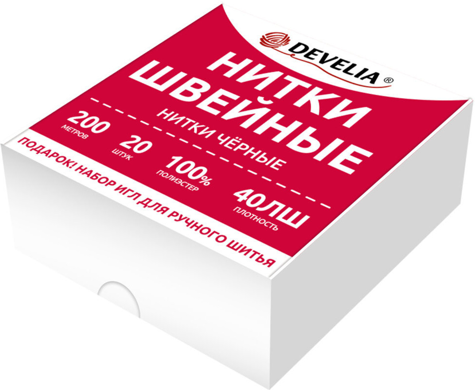 Набор ниток Develia характеризуется высоким качеством исполнения. Нитки в наборе применяются для всех видов одежды, обладают отличными пошивочными свойствами и подходят как для ручного шитья, так и для всех видов швейных машин. В набор входит 20 катушек 40 ЛШ черного цвета в намотке 200 м и набор игл для ручного шитья (15 штук). Поставляются в картонной коробке.