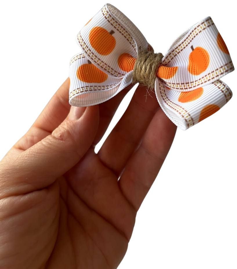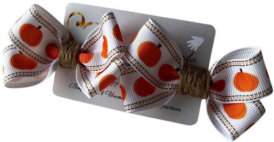 Набор бантиков для волос ручной работы на заколках из 2 штук, тыквы. Размер бантика 4×7 см, длина заколочки (зажима) 4,5 см. Бантики однослойные. Материал — плотная репсовая лента, заколка для волос (зажим) с зубчиками. Каждый набор бантиков упакован в индивидуальную крафт-коробочку, которая может служить и подарочной упаковкой, и для дальнейшего хранения.