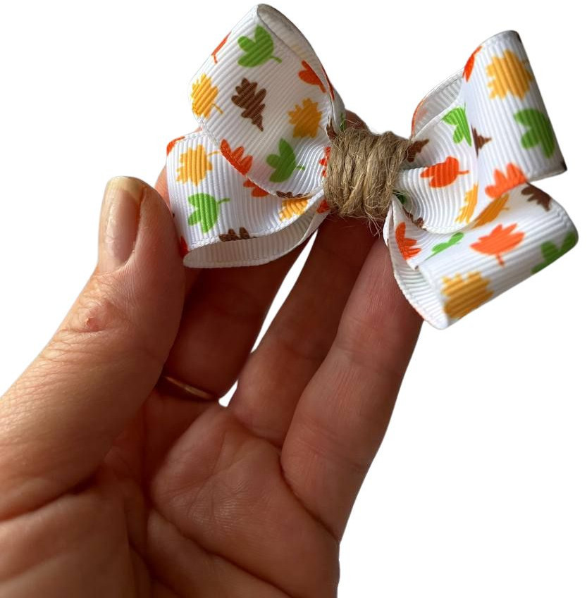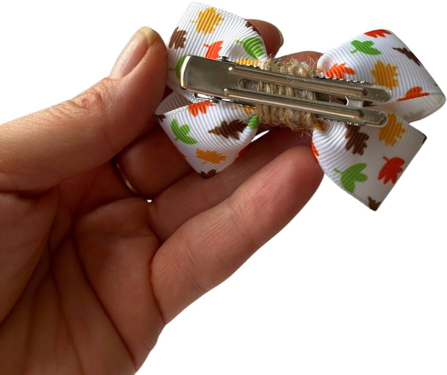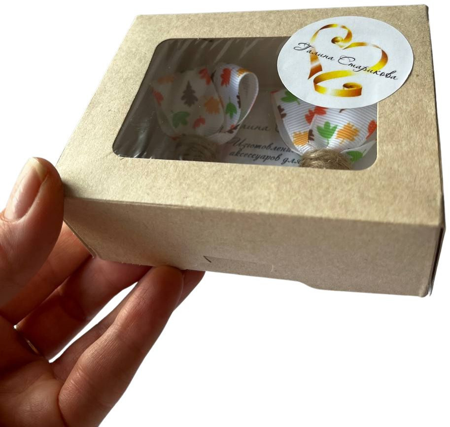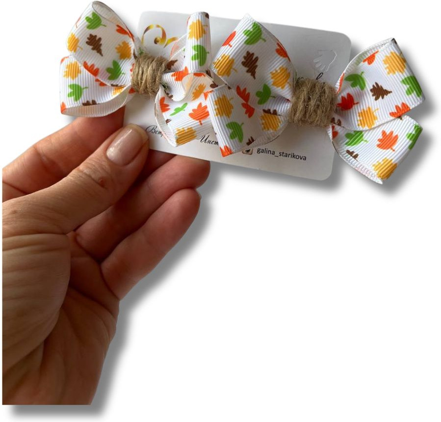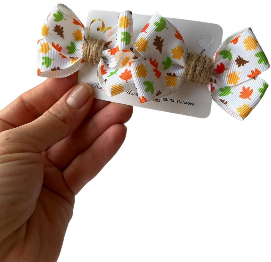 Набор бантиков для волос ручной работы на заколках из 2 штук, осенние листья. Размер бантика 4×7 см, длина заколочки (зажима) 4,5 см. Бантики однослойные. Материал — плотная репсовая лента, заколка для волос (зажим) с зубчиками. Каждый набор бантиков упакован в индивидуальную крафт-коробочку, которая может служить и подарочной упаковкой, и для дальнейшего хранения.