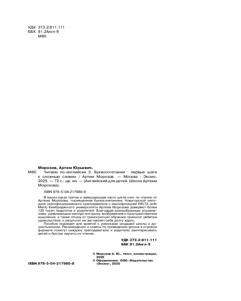 Серия: Английский для детей. Школа Артема Морозова Третья книга по чтению для детей от Артема Морозова, основателя успешного проекта Mishkie и сертифицированного преподавателя, посвящена буквосочетаниям! Уникальная авторская методика завоевала доверие более 120 тысяч педагогов и родителей. Забудьте о перегрузке детей запоминанием букв и сложной транскрипции! Артем Морозов предлагает простой и эффективный подход, который убирает искусственные барьеры и значительно ускоряет образовательный процесс. |
