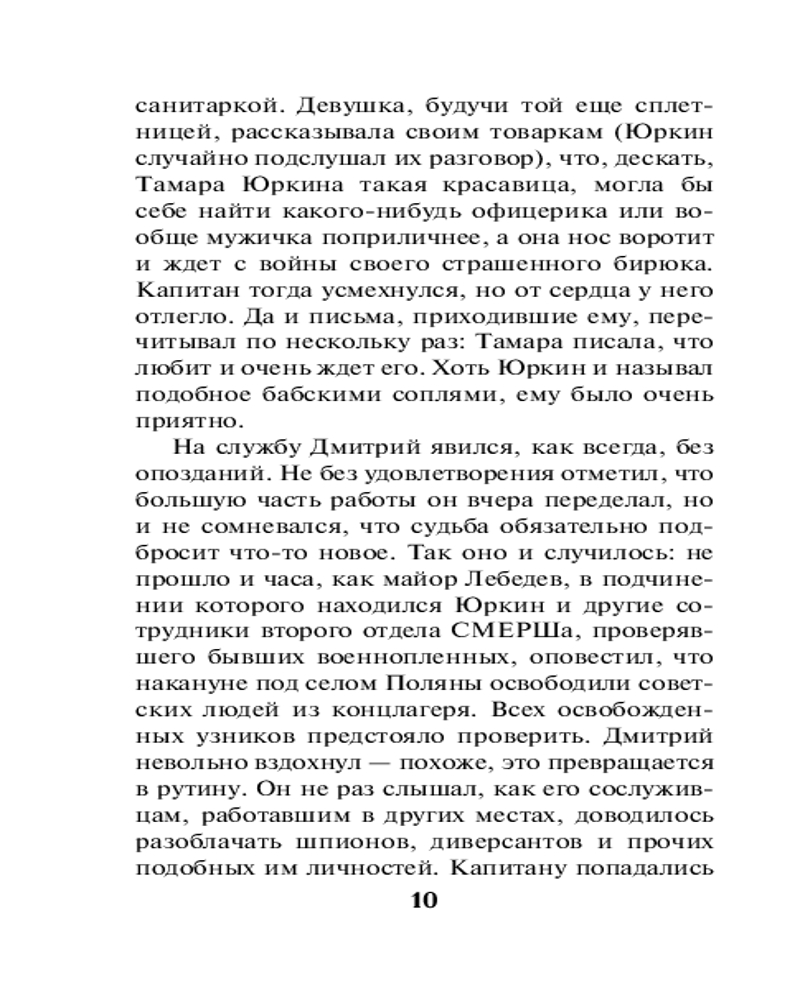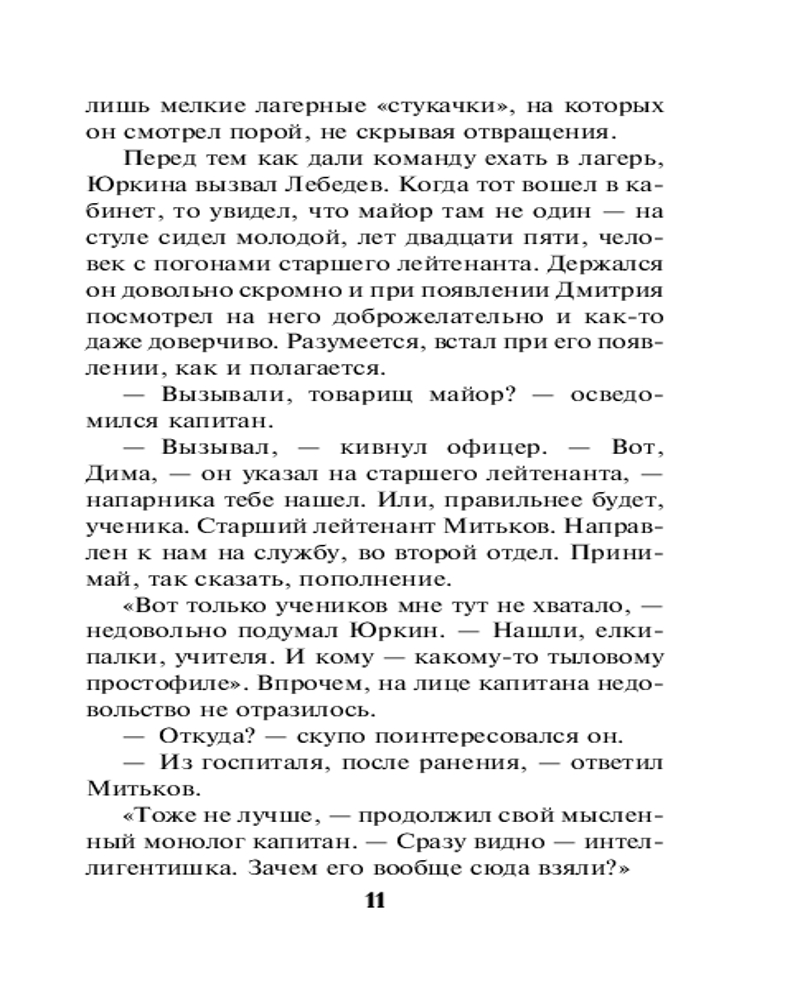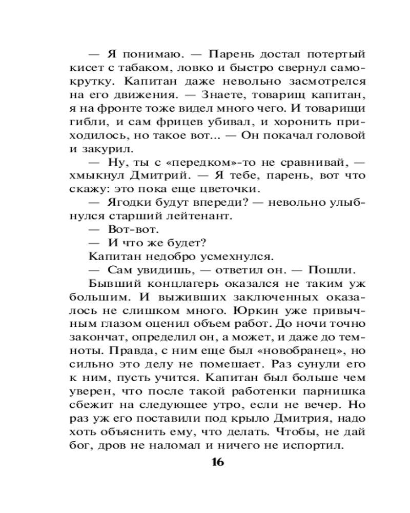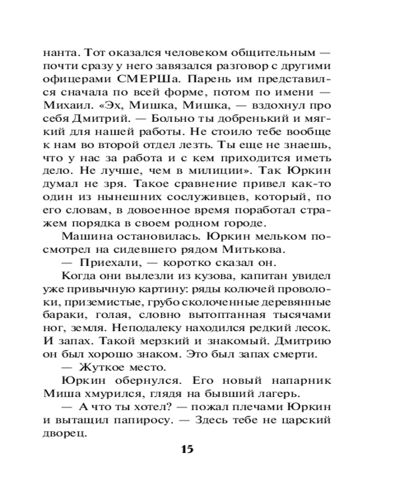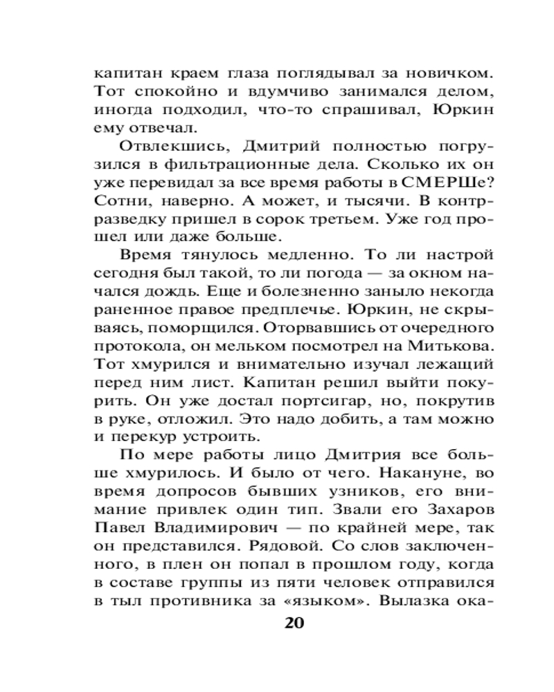 Капитан СМЕРШа Дмитрий Юркин, занимаясь фильтрацией советских военнопленных, освобожденных из концлагеря, обратил внимание на одного из бывших узников, красноармейца Павла Захарова. У бойца типичная легенда: попал к немцам без сознания, контактов с абвером не имел, в лагере вел себя тихо, ни во что не вмешивался... Именно эта «неприметность» и заинтересовала капитана. Что, если такое поведение — часть секретного плана, а сам пленный — не тот, за кого себя выдает... Юркин решает применить к Захарову особый подход и неожиданно получает такие откровения, от которых оперативнику становится не по себе...