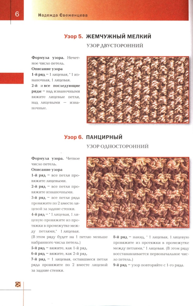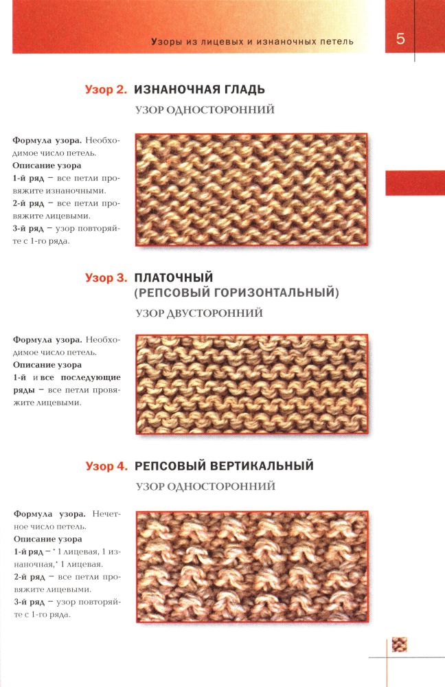 Мне книга очень понравилось. Все здесь понятно и доходчиво поясняется и никакие схемы здесь абсолютно не нужны. Рисунки вовсе не простые, а именно увеличенные фотографии образцов-изделий, где отлично просматривается каждая петелька. Для меня это один из главных моментов. Мне нужно видеть, как будет выглядеть будущий рисунок и его подробное описание. В этой книге все эти условия выполняются. Рядом с каждым узором идет подробное описание каждого ряда раппорта. Такие описания сможет понять даже любая неопытная вязальщица. Когда нет хорошего описания, а только схема, я иногда долго не могу разобрать как вывязать узор в каком-то месте и иногда приходится перевязывать по несколько раз прежде, чем получается то, что надо. Здесь же все понятно. Приведу пример: Конец правой спицы проденьте в промежуток между второй и третьей лицевыми петлями и вытяните на себя обхватывающую петлю. Придерживая ее на спице указательным пальцем, сделайте накид и т.д. Кроме того, в начале раздела по определенному типу узоров даются исчерпывающие рекомендации и советы с четким объяснением нужных терминов, например, что такое перекидная петля. Таким образом все понятно и доступно, и у меня, по крайней мере, не остается вопросов. Единственное, чем бы я дополнила эту книгу, так это условными обозначениями, а так все устраивает. Иногда хочется связать тот же шарфик, используя не обычную резинку, а что-нибудь новенькое, и тогда начинаешь бродить по интернету в поисках интересного. А эта книга избавляет меня от лишних головоломок.