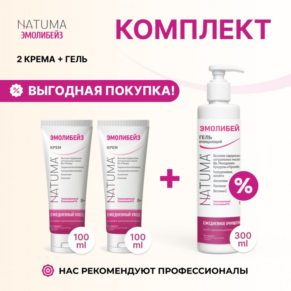 Гель-эмолент (очищающий): Aqua, acrylates copolymer, disodium laureth sulfosuccinate, decyl glucoside, cocamidopropyl betaine, sodium cocoamphoacetate, glycerin, shea butter glycereth-8 esters, macadamia seed oil glycereth-8 esters, corn oil glycereth-8 esters, arginine, panthenol, allantoin, phenoxyethanol, sodium hyaluronate, crambe abyssinica seed oil, tocopherol (vitamin E), ethylhexylglycerin, sodium hydroxide, citric acid. Aqua, Hydroxyethyl Urea, Glycerin, Caprylic/Capric Triglyceride, Glyceryl Stearate, Isohexadecane, Paraffinum Liquidum, Cetearyl Alcohol, Butyrospermum Parkii (Shea) Butter, PEG-100 Stearate, Myristyl Lactate, Biosaccharide Gum-1, Sodium Lactate, Olea Europaea (Olive) Fruit Oil, Panthenol, Allantoin, Phenoxyethanol, Sodium Polyacrylate, Sodium Hyaluronate, Tocopherol, Xanthan Gum, Ethylhexylglycerin, Citric Acid.