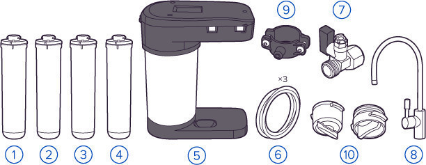 В комплекте: модуль K5; сменный картридж K2; модуль сменный мембранный KО-100S; сменный картридж K7M; корпус DWM в сборе; соединительные трубки (3 шт.), узел подключения; кран для чистой воды; дренажный хомут; сервисная заглушка.