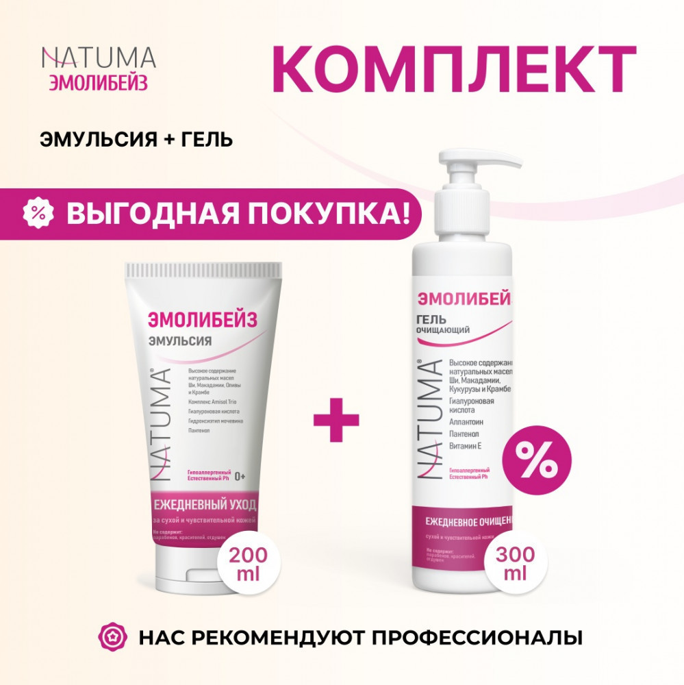 Гель-эмолент (очищающий): Aqua, acrylates copolymer, disodium laureth sulfosuccinate, decyl glucoside, cocamidopropyl betaine, sodium cocoamphoacetate, glycerin, shea butter glycereth-8 esters, macadamia seed oil glycereth-8 esters, corn oil glycereth-8 esters, arginine, panthenol, allantoin, phenoxyethanol, sodium hyaluronate, crambe abyssinica seed oil, tocopherol (vitamin E), ethylhexylglycerin, sodium hydroxide, citric acid.