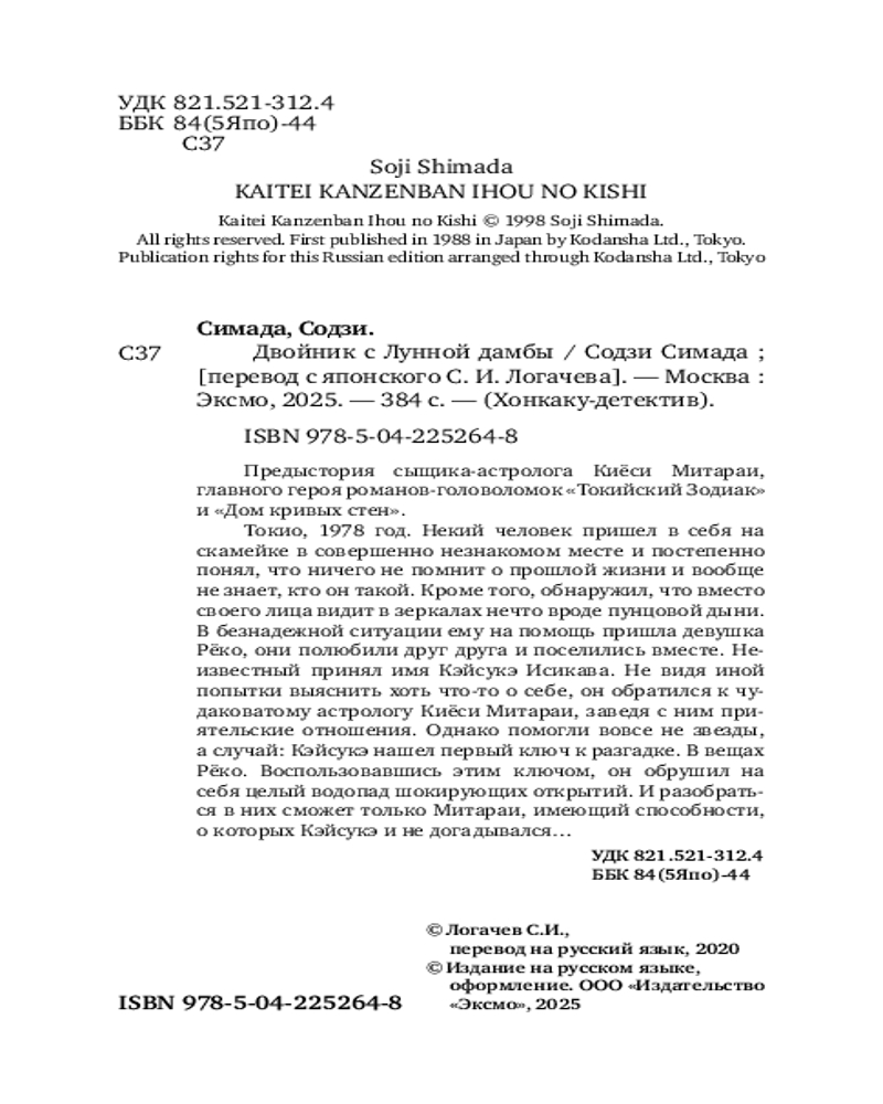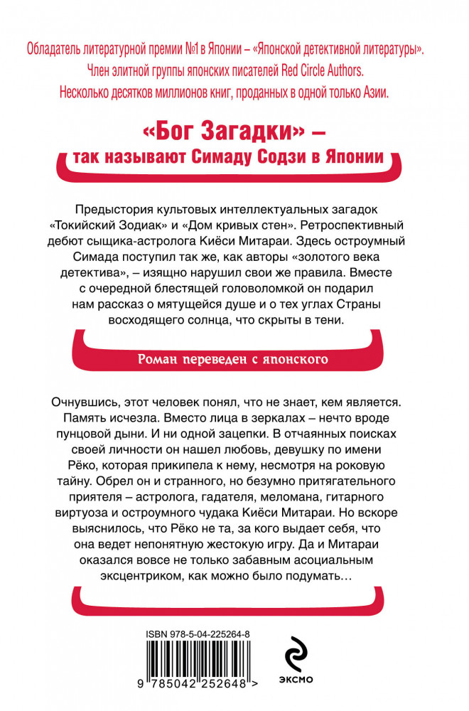 💳 Оплатить за товар можно при получении 🇰🇿 Есть бесплатная доставка по Казахстану 🎁 Копите бонусы с каждой покупки Серия: Хонкаку-детектив (клатчбук) Предыстория культовых интеллектуальных загадок «Токийский Зодиак» и «Дом кривых стен». Ретроспективный дебют сыщика-астролога Киёси Митараи. Здесь остроумный Симада поступил так же, как авторы «золотого века детектива», — изящно нарушил свои же правила. Вместе с очередной блестящей головоломкой он подарил нам рассказ о мятущейся душе и о тех углах Страны Восходящего Солнца, что скрыты в тени. |