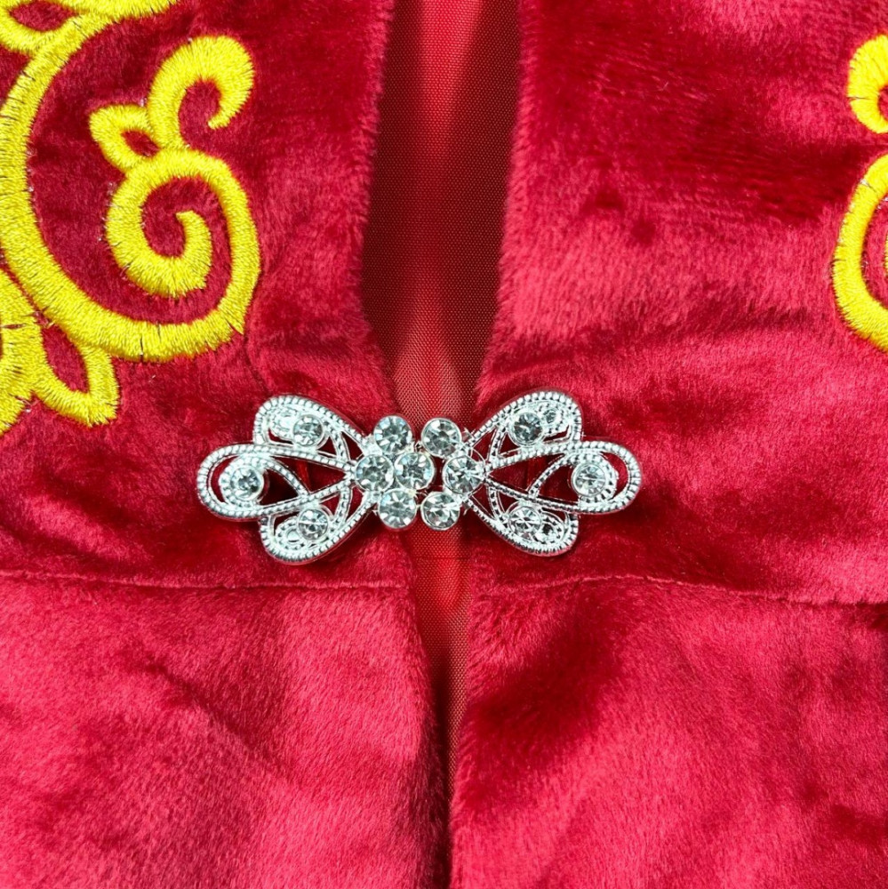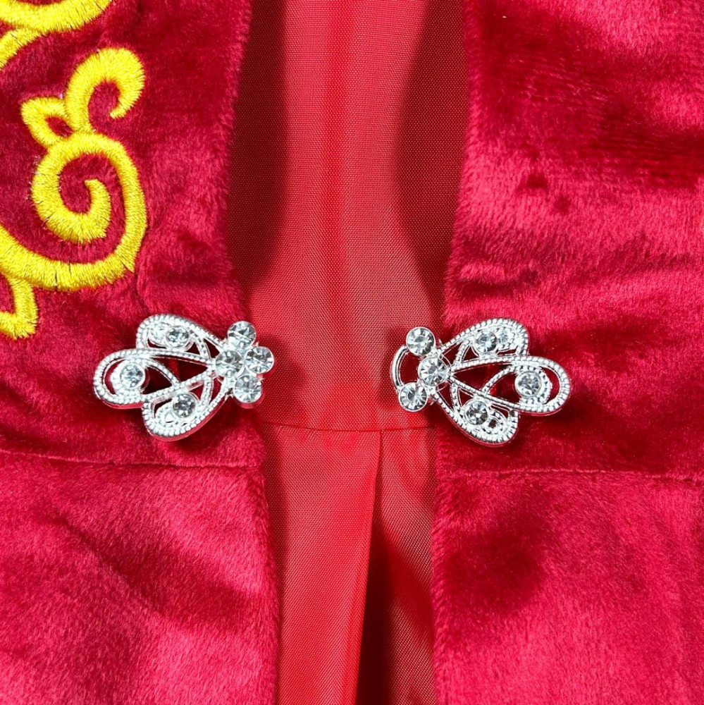 Нарядная детская жилетка из красного бархата с короткими волнистыми рукавами. Украшена золотистым вышитым узором по полочкам и декоративной застёжкой на уровне талии. Низ оформлен в виде лёгкой баски, придающей изделию праздничный вид.