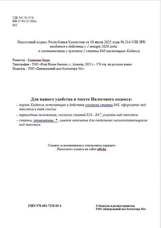 В данный момент этот товар отсутствует в продаже. Возможно, у нас найдется аналогичный или похожий товар здесь. Представляем вам Налоговый кодекс Республики Казахстан от 18 июля 2025 года № 214-VIII ЗРК, который вводится в действие с 1 января 2026 года в соответствии с пунктом 1 статьи 848 настоящего Кодекса.