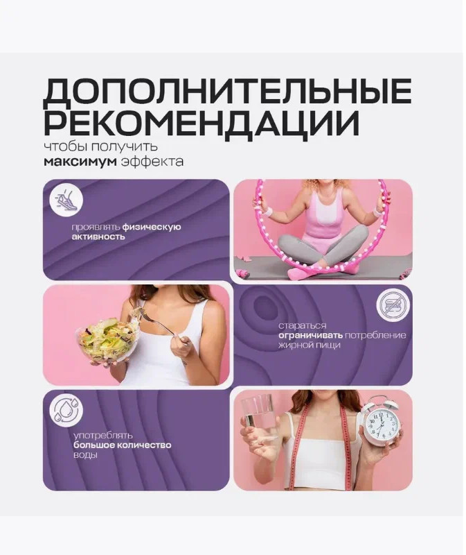 Устраняет отеки и выводит лишнюю жидкость из мягких тканей, и нормализация обменных реакций в организме помогает мягко и без побочки снизить вес и блокировать голод. Удаляет целлюлит и улучшает состояние кожи, волос, ногтей. Мягко и эффективно снижает вес и убирает отёки. Блокирует голод и позволяет дольше сохранять чувство сытости. Уменьшает объёмы талии, живота, ягодиц, бёдер. Убирает холку и второй подбородок.