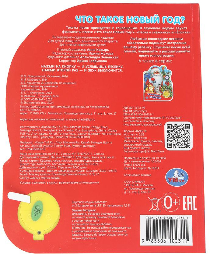 Музыкальная книга «Что такое Новый год?» ТМ «УМка» станет прекрасным подарком для малыша. Ребёнок с удовольствием будет листать плотные страницы, рассматривать яркие картинки и, конечно, нажимать на кнопку, слушать новогодние песенки и подпевать им. Малыш легко освоит включение звука: по нажатию на кнопку песенка включится, при втором нажатии выключится, при третьем — заиграет следующая композиция. Благодаря удобному формату книгу можно взять с собой в путешествие. Игра с музыкальной книгой ТМ «УМка» развивает: слуховое восприятие, навык чтения, фантазию, образное мышление и память. |