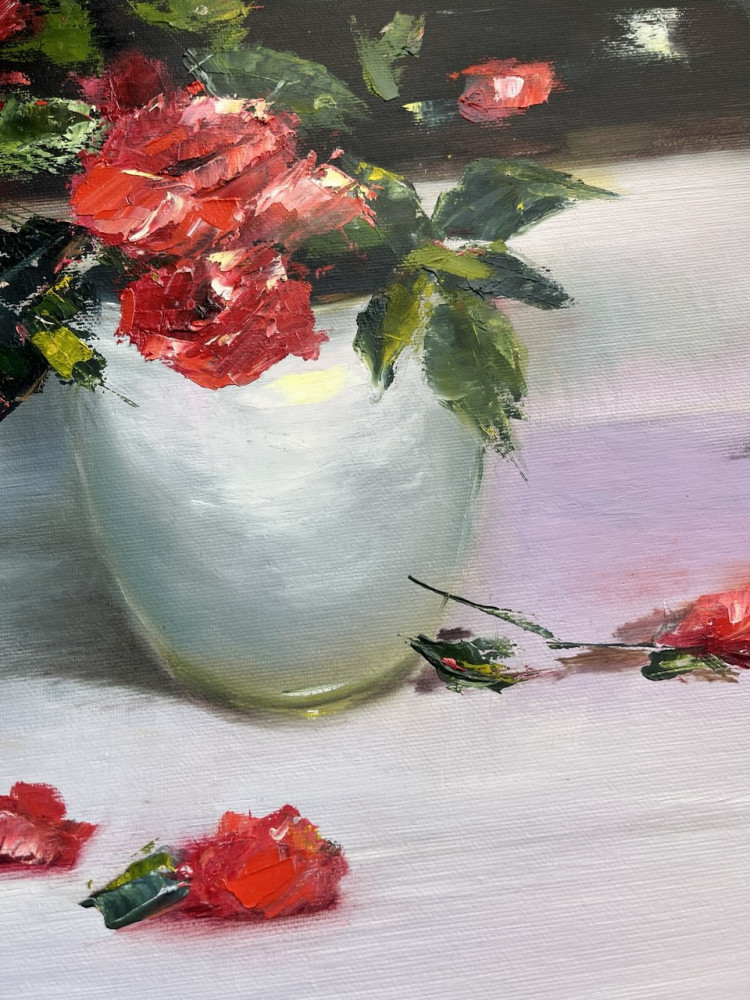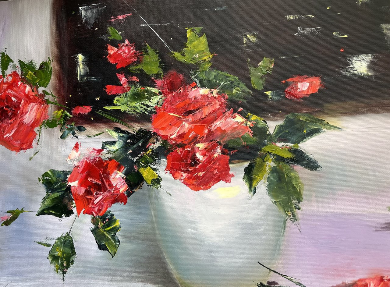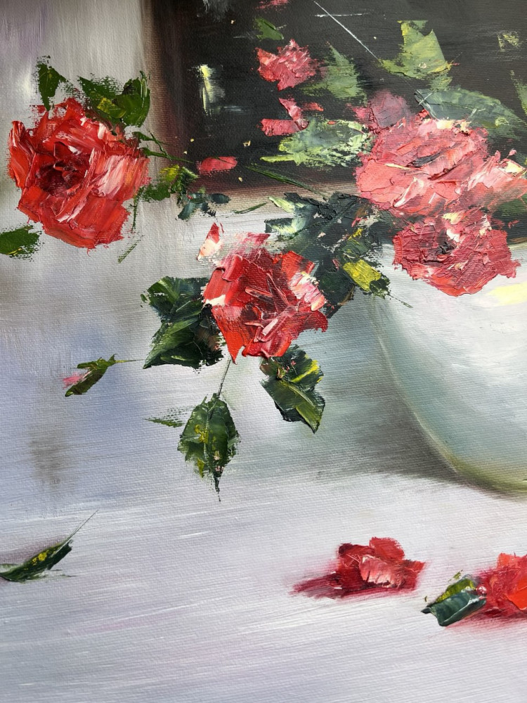 Картина маслом «Розы и свет» — тёплый натюрморт в пастозной технике. Яркие мазки, фактура, живое дыхание цвета. Размер 40×50 см, холст на подрамнике. Насыщенные алые и розовые тона на светлом фоне создают ощущение тепла, движения и лёгкости, а фактурная поверхность добавляет глубину и выразительность. Отличный выбор для ценителей живописи и тех, кто ищет стильный интерьерный акцент. Картина оснащена подвесом — готова к размещению на стене. |