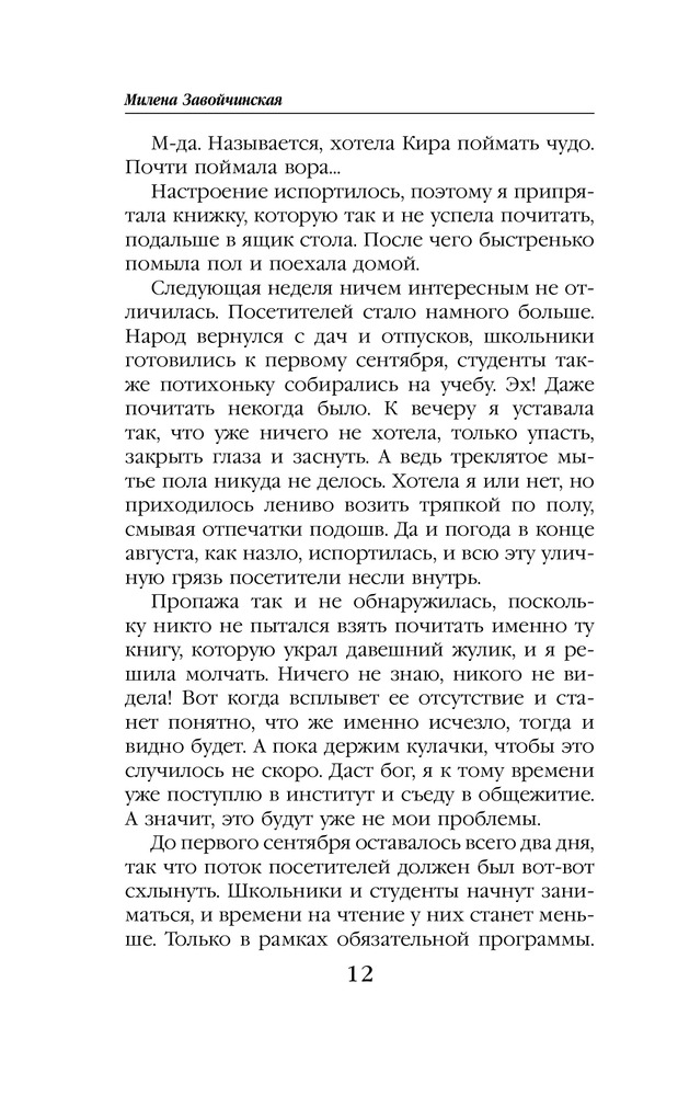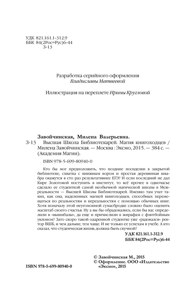 Высшая Школа Библиотекарей. Магия книгоходцевМилена Валерьевна Завойчинская В данный момент этот товар отсутствует в продаже. Возможно, у нас найдется аналогичный или похожий товар здесь. Серия: Академия магии Кто бы мог предположить, что поздние посиделки в закрытой библиотеке, схватка с книжным вором и простая деревянная швабра окажутся в сто раз результативнее ЕГЭ? И если последний не дал Кире Золотовой поступить в институт, то всё прочее в одночасье сделало ее студенткой самой необычной магической школы в Межреальности, Высшей Школы Библиотекарей. Именно там учат таких, как она, наделенных магией книгоходцев, способных перемещаться по реальностям и нереальностям с помощью обычных книг. |