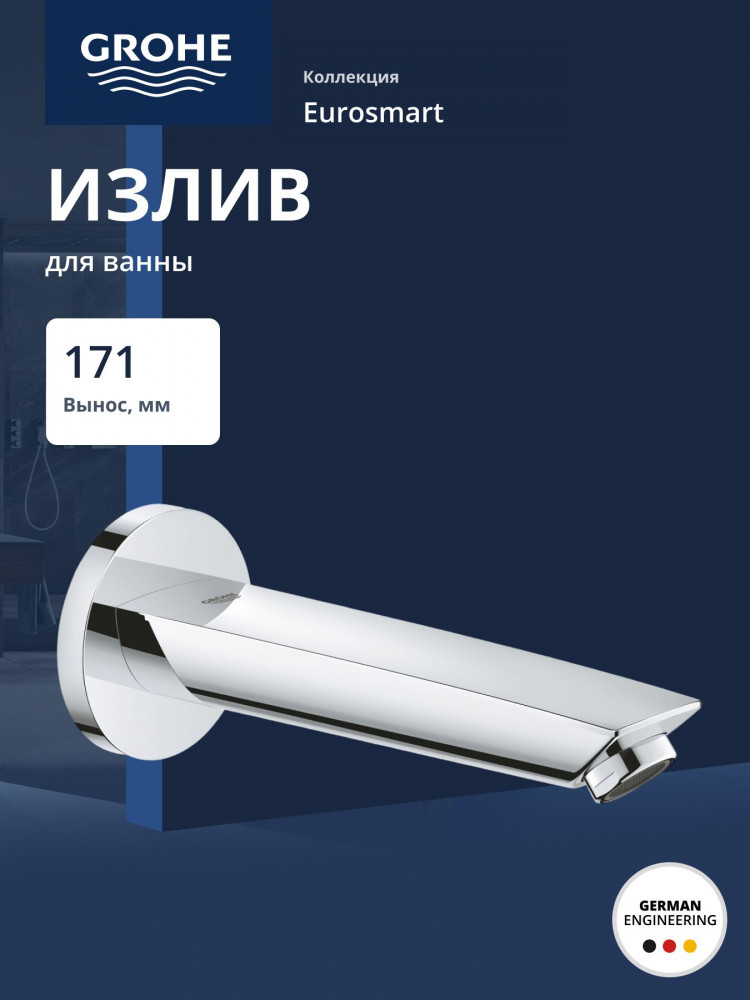 Данный излив для ванны с аэратором предназначен для настенного монтажа, его вынос составляет 171 мм, что позволяет с комфортом пользоваться им для мытья рук. Это устройство предназначено для использования в комбинации с комплектом внешней части смесителя для ванны Eurosmart (артикулы 24043003, 33305003 и 19450003). Износостойкое глянцевое хромированное покрытие Grohe Long-Life Finish поможет этому изливу для ванны сохранять первозданный внешний вид на протяжении многих лет. Рекомендуется эксплуатация в системах с давлением воды не менее 1 бар.