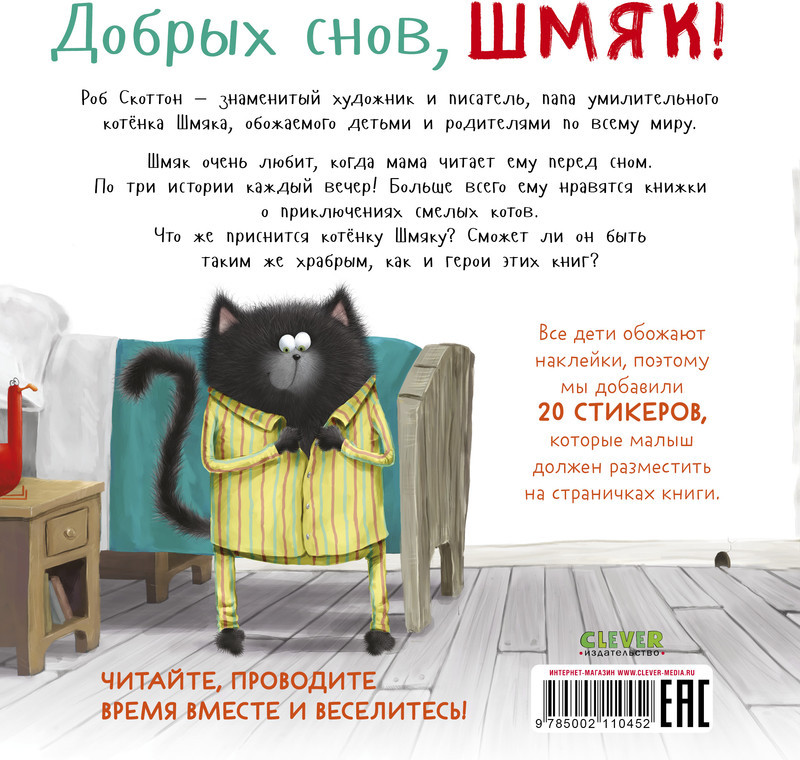 Серия: Книжки с наклейками Книжка с наклейками «Добрых снов, Шмяк!» — это новый интерактивный формат любимой истории. Под мягкой обложкой вас ждут знакомые герои — Шмяк, Шип, Китти.На этот раз котенок Шмяк никак не может заснуть. Он боится, что ему снова приснится сон, в котором злой король Шип победил его и увез принцессу Китти. Шмяк всю ночь не может уснуть. Но когда засыпает, видит прекрасный и удивительный сон! В новом формате книги малыша ждет развивающая игра с наклейками. С помощью 20 стикеров ребенок сам сможет дополнить иллюстрации. Чтобы он с легкостью нашел место, куда клеить, на страничках есть подсказки. Развиваем логику, внимание, мышление! Играя с наклейками, ребенок сам поучаствует в создании книги про любимого героя. Это забавная история, которая понравится малышам и научит их справляться со своими страхами. А еще она может помочь родителям уложить деток спать. Вместе со Шмяком пора чистить зубки, надевать пижаму и ложиться в кроватку слушать сказку. А если приснится страшный сон... то потом, как и Шмяку, обязательно приснится другой сон — прекрасный и удивительный! |