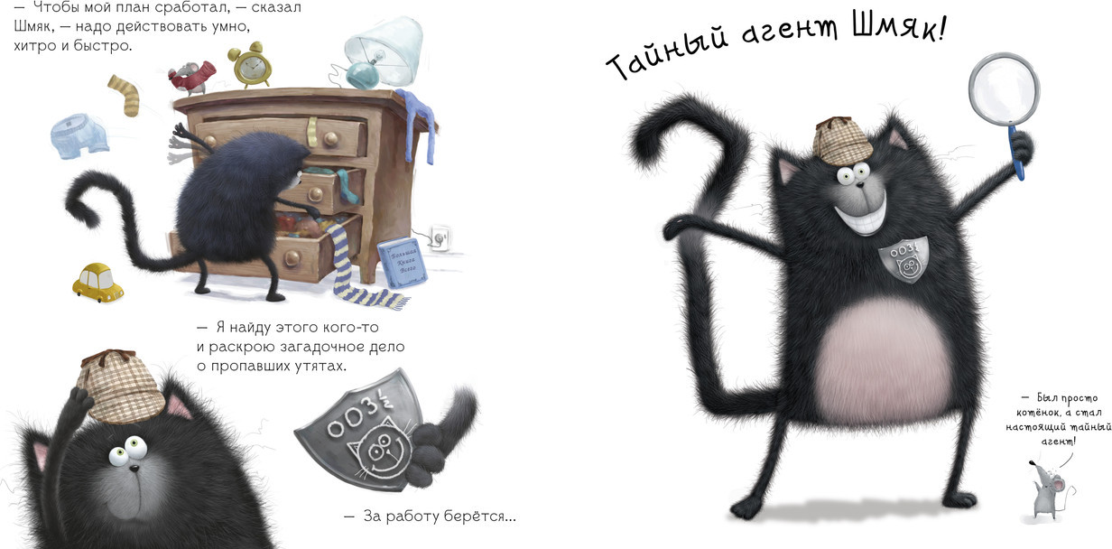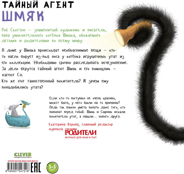 Серия: Книжки-картинки Любимые истории про котенка Шмяк в удобной МЯГКОЙ ОБЛОЖКЕ! В доме у Шмяка происходят необъяснимые вещи — кто-то нагло ворует у котенка игрушечных утят из его коллекции. Необходимо срочно расследовать исчезновение. За дело берутся тайный агент Шмяк и его помощник — «агент С». Кто же этот таинственный похититель? И зачем ему понадобились утята? Если кто-то поступил не очень красиво, может быть, у него были на то причины? Ведь так важно уметь понять даже того, кто виноват перед тобой. Шмяк и Сырник искали похитителя утят, а нашли... нового друга. Книгу создал Роб Скоттон, знаменитый художник и писатель, папа умилительного котёнка Шмяка, обожаемого детьми и родителями по всему миру. |