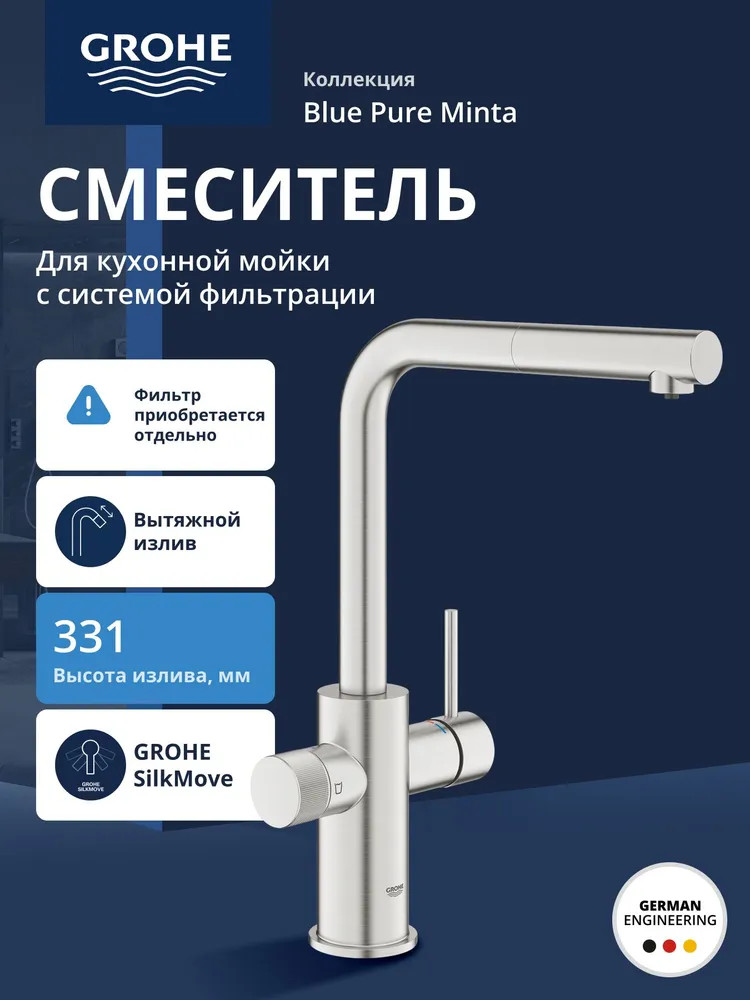 Чтобы наслаждаться вкусной водой прямо из источника и избежать необходимости покупать и хранить бутилированную воду, установите кухонный смеситель Grohe Blue Pure Minta. Он разработан для комбинирования с различными фильтрами Grohe Blue, в размерах S, M и L, или сочетайте его с фильтром Magnesium+Zinc, Ultrasafe, Activated Carbon, Reverse Osmosis или Reverse Osmosis Mineralisation в соответствии с вашим вкусом и образом жизни. Наш обновленный дизайн обеспечивает более легкое управление, с рифленой поворотной ручкой для получения вкусной питьевой воды теперь на том же уровне, что и однорычажная ручка, которая обеспечивает смешанную, нефильтрованную воду для ваших ежедневных кухонных дел. Последняя имеет внутри керамический картридж Grohe SilkMove, который обеспечивает плавный и точный контроль объема и температуры. И есть отдельные внутренние водные пути, чтобы гарантировать, что фильтрованная и нефильтрованная вода не смешиваются.