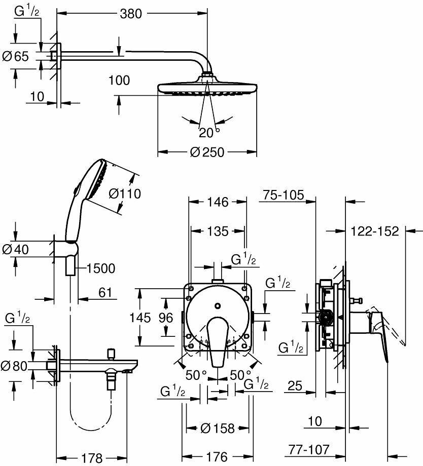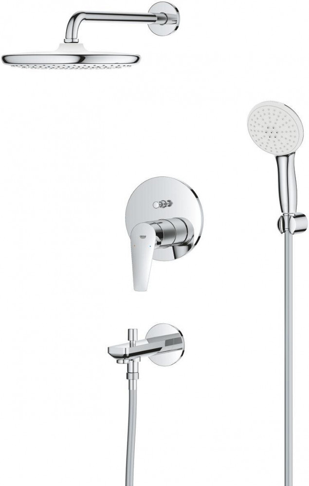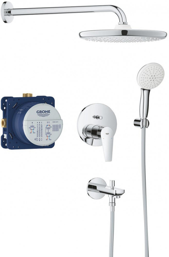 Душевая система Grohe BauEdge — это сочетание современного стиля и функциональности «всё в одном». Плавное управление потоком и температурой воды обеспечивается благодаря прочному керамическому картриджу и цельному металлическому рычагу. Верхний душ диаметром 250 мм с кронштейном длиной 380 мм создаёт струю Rain. Ручной душ диаметром 110 мм имеет два варианта струи с помощью инновационного переключателя: мощная струя Jet, которая подходит для мытья волос, и струя Rain, нежная, как летний дождь. Ручной душ оснащён силиконовым кольцом, которое защищает от повреждений при падении, держателем и шлангом длиной 1500 мм. Износостойкое и простое в уходе покрытие сохраняет комплект в первозданном виде на долгие годы. Установка выполняется быстро и легко благодаря системе с фиксацией, накладкой и уплотнением вала, что исключает риск протечек. Некоторые технологии, которые используются в системе: Grohe DreamSpray, Grohe FastFixation, Grohe Long-Life, Grohe Rapido SmartBox, Grohe ShockProof, Grohe SilkMove, Grohe Speed Clean.