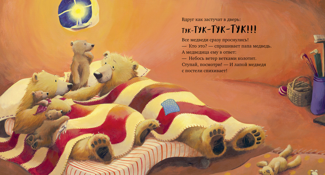 В далеком лесу бушует ураган! Сверкают молнии, пляшут странные тени и кажется, будто чудище воет у двери! Как тут заснуть маленьким медвежатам? Самое уютное и безопасное место сейчас — комната мамы и папы, ведь с папой буря не страшна! Вот только и папе теперь не спится! Шумит лес, ветви деревьев стучат в окно, гремит гром. И что это за жуткая тень на стене? Быть может медвежата правы, и за дверью кто-то есть? Кого встретили медведи вы узнаете в этой забавной сказке! Чудесные иллюстрации очаруют и детей, и взрослых, а добрая история рассмешит и научит не бояться неизвестного.
