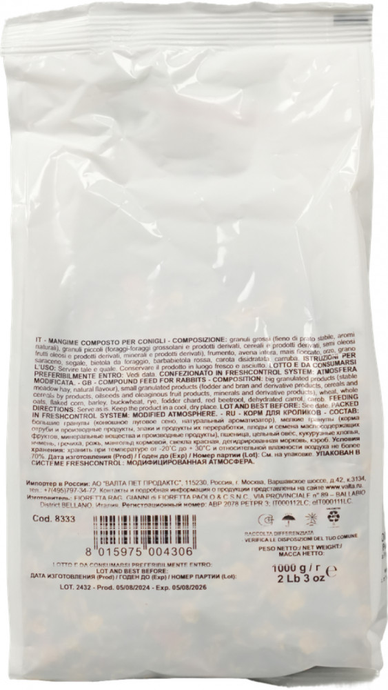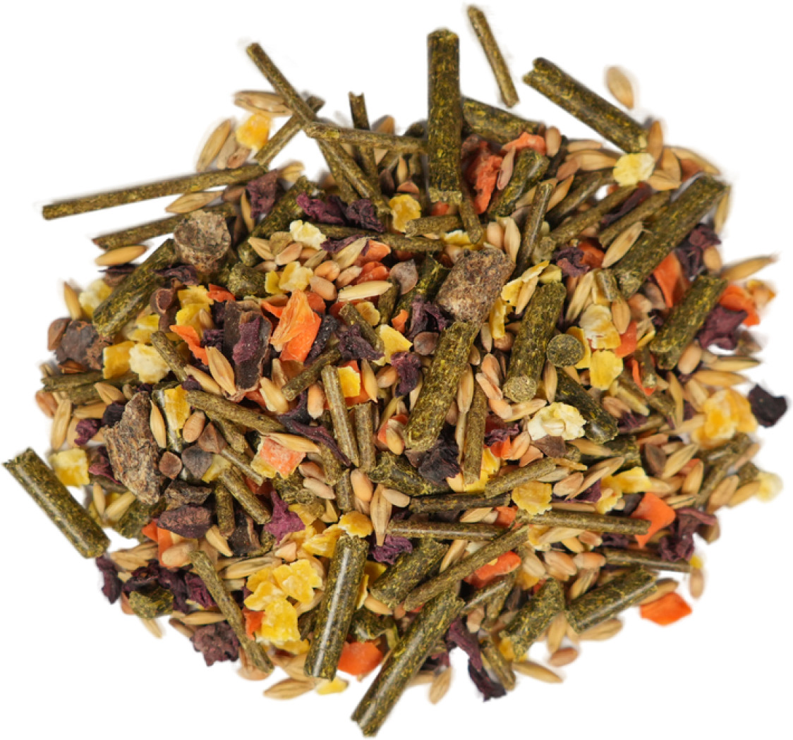 Большие гранулы (конюшное луговое сено, натуральный ароматизатор), мелкие гранулы (корма, отруби и производные продукты, злаки и продукты их переработки, плоды и семена маслосодержащих фруктов, минеральные вещества и производные продукты), семена: пшеница, цельный овёс, очищенный овёс, ячмень, гречиха, рожь, мангольд кормовой, свекла красная, дегидрированная морковь, кэроб.