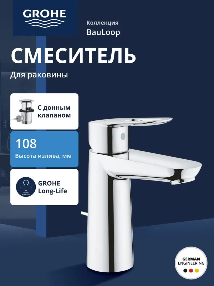Смеситель для раковины Grohe BauLoop 23762000 предназначен для раковины. Своим лаконичным дизайном и колористикой он внесет в интерьер помещения стильный акцент, подчеркнув его своеобразие. Он выполнен из надежного материала латунь, который не ржавеет, а потому прослужит не создавая проблем. Модель является прекрасным примером продуманной конструкции. Управление в смесителе предусмотрено однорычажное, что порадует любителей такого типа смесителей. Высокую жизнеспособность и основательность смесителю гарантирует керамический картридж, отличительной чертой которого является беспроигрышная конструкция — залог безупречной работы в течение продолжительного времени. Не напрасно гарантия на смеситель — 5 лет, в течение которого компания Grohe заверяет в его бесперебойной работе. Форма излива в смесителе — традиционная, а тип — фиксированный. При покупке учтите, что подводка у смесителя гибкая, что требуется знать для его подключения.