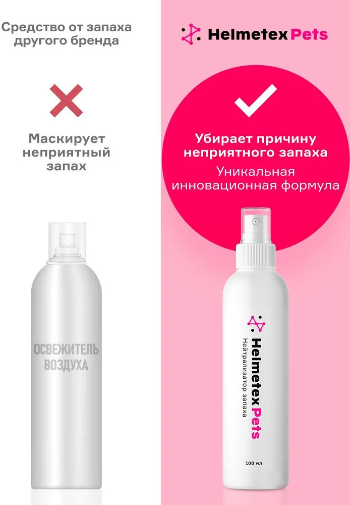Helmetex — это не освежитель воздуха, который маскирует запах лишь временно, а профессиональное средство, разработанное российскими учеными, которое удаляет источник неприятного запаха животных с вещей и предметов: с дивана, кресла, стула и другой мягкой мебели, с ковров, ламината и других напольных покрытий, с подушек, одеял, занавесок, дверей, стен и т.д., а также эффективен для обработки в труднодоступных местах. Helmetex Pets безопасен для обработки любых материалов: текстиль, поролон, натуральная и искусственная кожа, замша, пластик и т.д.