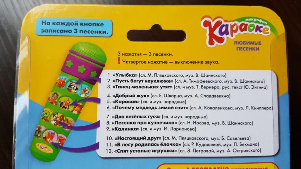 Микрофон чудесный. Внуку 5 лет и он с удовольствием поет песенки и танцует, на ночь убирает под свою подушку. Жаль только, что песенки представлены не полностью, а только первый куплет.