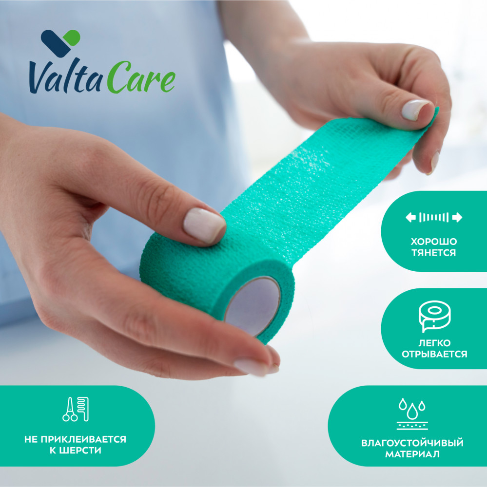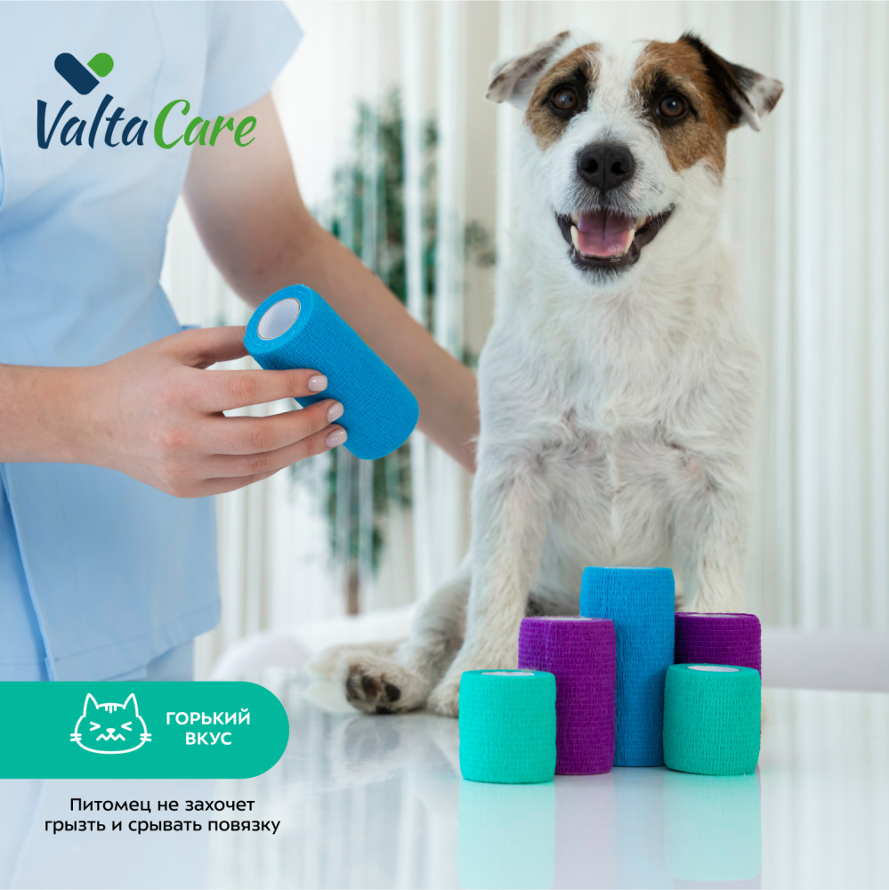 ValtaCare бинт самофиксирующийся с горькой пропиткой для животных применяются в качестве бандажа в послеоперационный период, при мелких ранах и легких повреждениях кожи, для изолирования внутривенных катетеров, для остановки крови и предупреждения образования гематомы в месте забора крови, при растяжениях, для фиксации лечебных препаратов и перевязочных материалов на месте раны и т.д.
