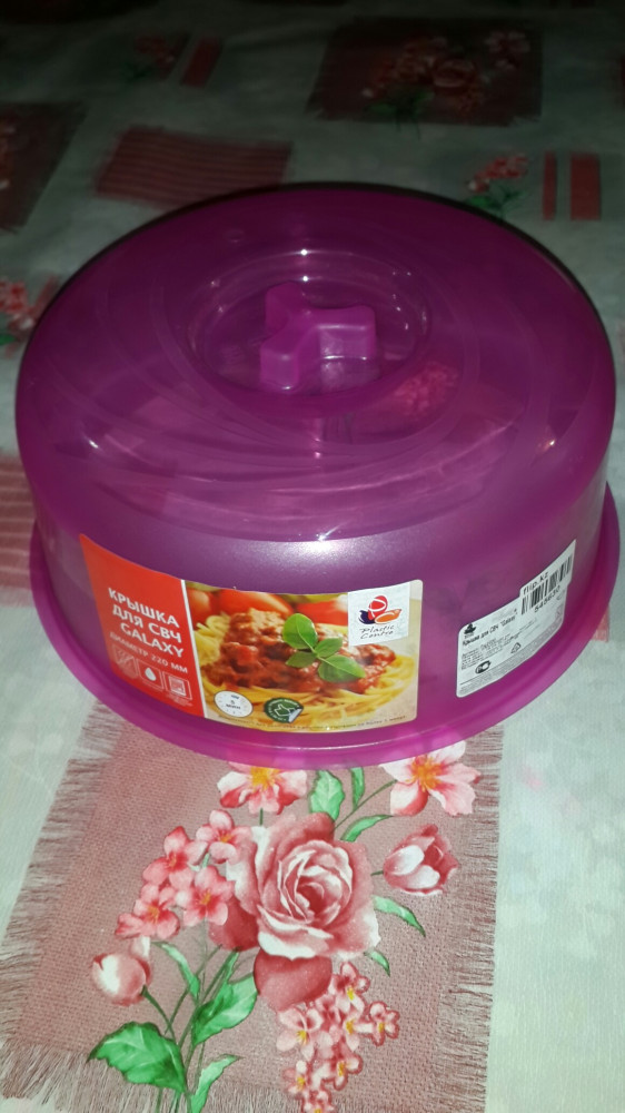Идеально подходит крышка 22см. на микроволновой тарелке и по высоте хорошо все. Не такая уж крепкая пластика, тонковато, но будем пользоваться бережно. Цвет красивый розовый и без единого запаха.