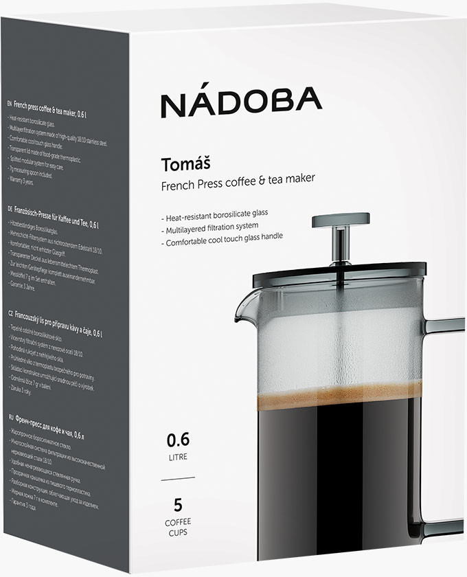 Френч-пресс Nadoba серии Tomáš выполнен из жаропрочного боросиликатного стекла. Многослойная система фильтрации из высококачественной нержавеющей стали 18/10 отлично справляется даже с самыми мелкими частицами чая. Специальное PVC покрытие делает колбу прочной и защищает от мелких повреждений. В комплекте предусмотрена мерная ложка 7 г для более точной дозировки. Френч-пресс Nadoba серии Tomáš допускается мыть в посудомоечной машинке. Гарантия на изделие 3 года.