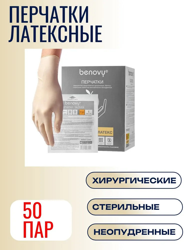 Перчатки хирургические стерильные одноразовые «Benovy» из натурального латекса текстурированные неопудренные натурального цвета используются в качестве защитного барьера на руках медицинского работника в хирургическом поле. Перчатки используются в основном как двусторонний барьер для защиты пациента и медперсонала от различных загрязнений микроорганизмами. Перчатки хирургические стерильные предназначены для продолжительных оперативных хирургических вмешательств.