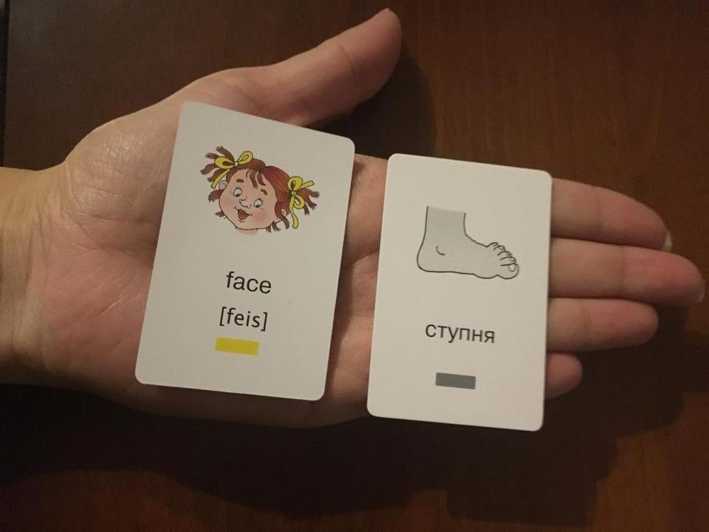 Очень понравились карточки. Плотный картон, размер небольшой, как раз для детских ручек. С одной стороны слово по-русски и его не цветное изображение, с другой стороны перевод этого слова на английский язык с цветным изображением и транскрипцией. Весело изучать английский язык в такой игровой форме!