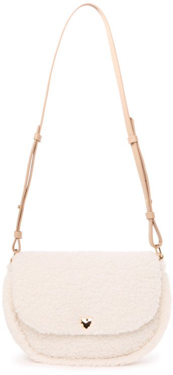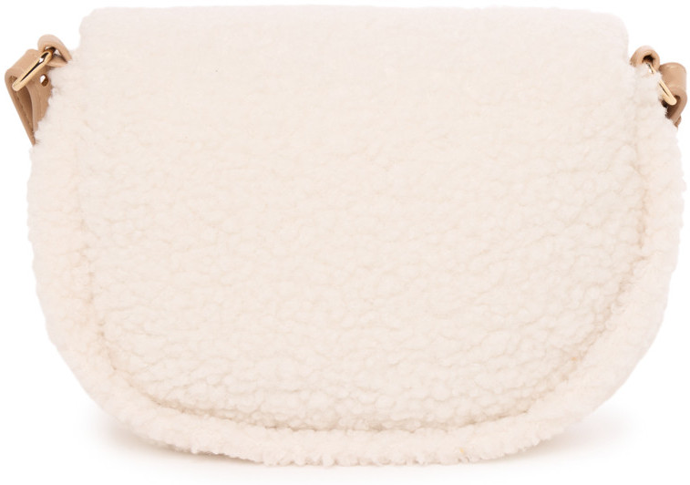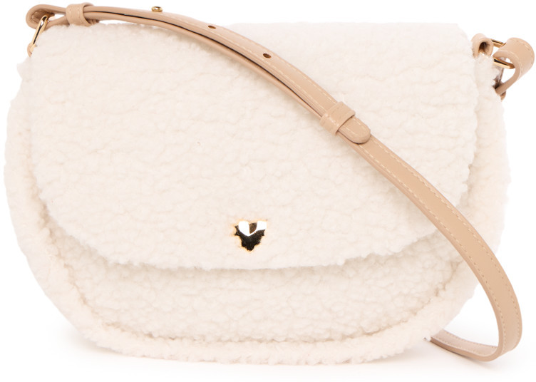 Сумка через плечо из мягкого материала шерпа с подкладкой из сатина. Выполнена в кремовом цвете с регулируемым бежевым ремешком. На передней части — застёжка-кнопка золотого цвета в форме сердца. Задняя сторона гладкая.